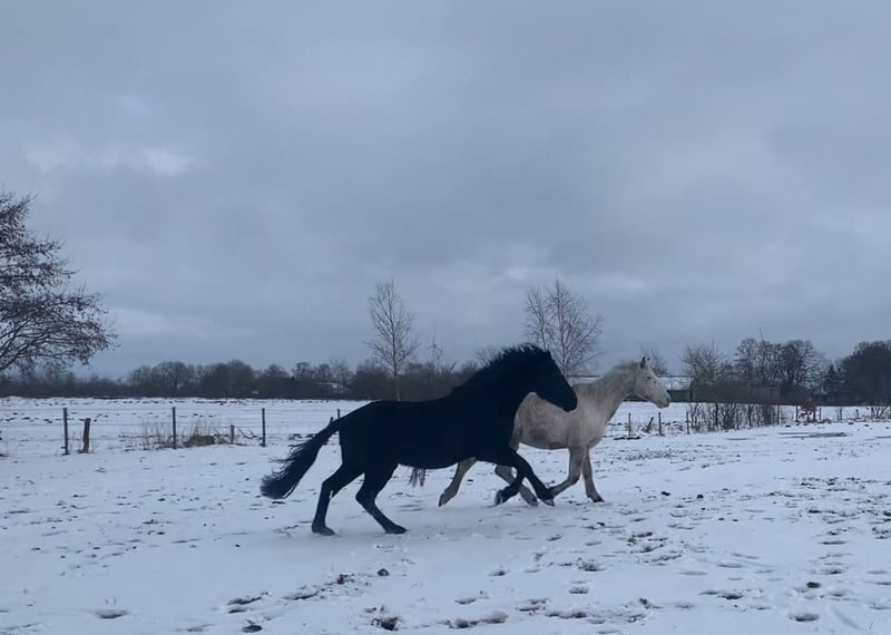 Rappe ohne Abzeichen, kompakter barocker Körperbau, Damenreitpferd, super schöner Behang und herrliche nicht übertriebene aber ausdrucksstarke Bewegungen. Charakterlich ist Delano ein Goldschatz, der mit seinem Reiter durchs Feuer gehen wird. Mutig, dem Menschen zugewand, in sich ruhend, verspielt, lernwillig. Er ist als Cruzado Iberico eingetragen, seine Mutter ist eine Warlander Stute, sein Vater ein Reitponyhengst. Eine gelunge Kombination! Er wird nur schweren Herzens aufgrund veränderter Lebensumstände in reiterlich fördernde Hände abgegeben. Bestens geeignet für die barocke, iberische, akademische Reitkunst und auch als Showpferd kann ich ihn mir sehr gut vorstellen. Wohlerzogener, reiseerfahrener (Stallwechsel, Pferdeanhänger und kleiner LKW), geländesicherer Junghengst (Spaziergänge, Handpferd). Spätentwickler!