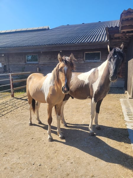 Our boy is the son of a Foxtrotter Curly mare and a Paint stallion, and he is expected to reach a final height of 1.48 - 1.50m. He is a friendly, curious, and people-oriented character, and he is now at the ideal age to start. He has grown up in a herd in a paddock and is currently in a group of boys. He is easygoing in the herd and has a mid-ranking position. He is looking forward to a nice home and many adventures.