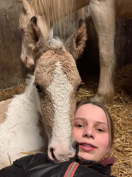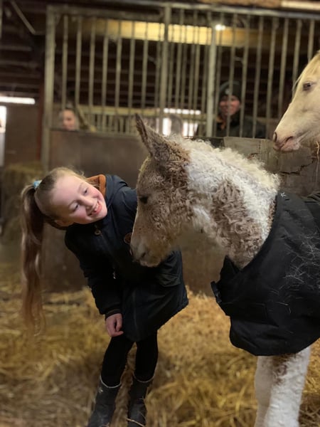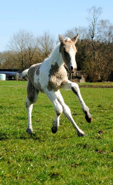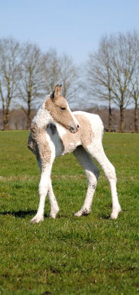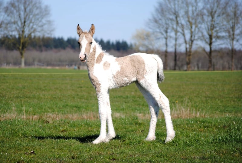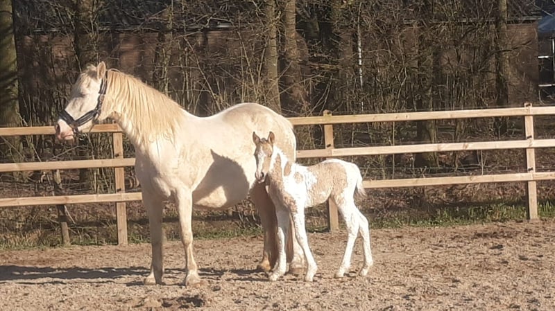 Heavenlysmiles Power Chick Auch bekannt als Chickie Am 16. März war es soweit: Chris brachte eine wunderschöne, falbe schecke Tochter mit traumhaft lockigem Fell zur Welt. Sie ist so schön 🥰 Sie stand sofort auf und fand direkt das Euter – ein großartiger Start! Chickie stammt von unseren besten Tieren und von mehreren Tieren aus unserer eigenen Zucht väterlicher- und mütterlicherseits ab. Wir wissen also genau, was in ihr steckt ♡ Sie wird eine stattliche Größe von 1,60 m erreichen. Sie ist sehr freundlich und angenehm neugierig; sie kommt immer, um nach einem zu sehen! Ihre Bewegungen zeigen einen raumgreifenden, kraftvollen Gang – nicht kniehoch, sondern eher schwebend und schwungvoll. Ein wahrer Augenschmaus und bald eine Freude in der Arbeit. Wir halten ihren Typ für einen Traumtyp: eine wunderschöne Größe von 1,58/1,60 m und ein robuster, eleganter Körperbau. Sie trägt das sp6-Gen für lockiges Fell. Daher wird sie eine wunderschöne, kräftige Stute mit einem außergewöhnlich schönen Typ, einer prächtigen Farbe mit feinen Winterlocken und einem wundervollen Charakter. Kurz gesagt: ein vielversprechendes Nachwuchspferd! Für weitere Informationen senden Sie uns gerne eine Nachricht. Wir haben ein Fotoalbum auf Facebook und viele Videos auf unserem WhatsApp-Kanal!