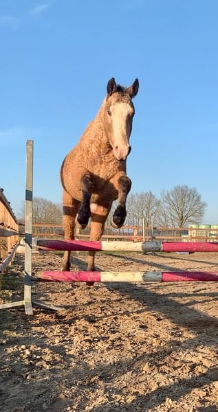 Seine Fellfarbe, Falbe Overo und die blauen Spots in seinen Augen sind ein echter Eyecatcher. Er wird +1.50, hat einen tollen Körperbau, Charakter und sehr gute Bewegung.