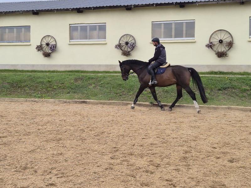Dobrze wyszkolony wałach. Przytulny koń zaufania, zarówno w hali, na placu, jak i w terenie. Aktualnie zdobył pierwsze miejsce w konkursie skoków i wielokrotnie zajął miejsca na podium. Dzięki swojemu wyjątkowemu, kochającemu usposobieniu nadaje się również dla początkujących i powracających do jazdy, a także jako koń rodzinny. Nigdy nie przestraszył się ani nie wykonał boków w naszym towarzystwie. Jest czyszczony samodzielnie przez 3-letnie dziecko i zawsze pewnie chodzi na lonży z pasem do wkkw. Zawsze jest miły w obcowaniu i w każdej sytuacji. Nawet na zawodach nic go nie wyprowadza z równowagi. Życzymy mu domu z dużą przestrzenią do ruchu, kontaktami społecznymi i miłością. Aby oszczędzić koniowi turystyki jeździeckiej, opłata za jazdę próbną wynosi 30 €.