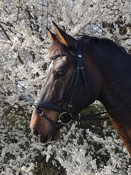 Gut ausgebildeter Wallach. Verschmustes Verlasspferd, ob in der Halle, auf dem Platz oder im Gelände. Er hat aktuell Springpferde-A gewonnen und ist vielfach platziert. Aufgrund seines einmaligen, liebevollen Wesens auch für Anfänger und Wiedereinsteiger sowie als Familienpferd geeignet. Er hat sich bei uns noch nie erschrocken oder gebuckelt. Er wird von 3-jährigen Kind allein geputzt und geht mit Voltigiergurt jederzeit verlässlich an der Longe. Er ist immer lieb im Umgang und in jeder Situation. Auch auf Turnier bringt ihn nichts aus der Ruhe. Wir wünschen für ihn ein Zuhause mit viel freier Bewegungsmöglichkeit, Sozialkontakten und Liebe. Um dem Pferd Reittourismus zu ersparen, fallen für das Probereiten 30 € an.