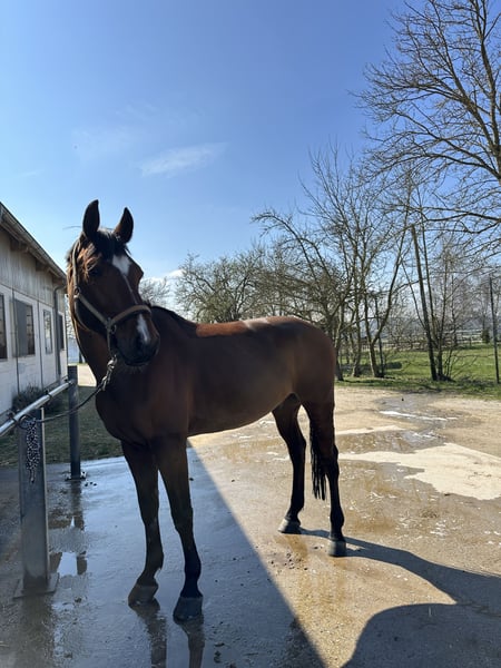 Verkaufe Tschechisches Warmblut – Springwallach, geb. 2018 Zum Verkauf steht ein eleganter brauner Warmblutwallach aus Tschechien, geboren im Jahr 2018. Mit einem Stockmaß von 163 cm vereint er typische Warmblutqualität mit viel Potenzial für den Springsport. Im Training wird er bereits auf L Niveau trainiert. Der Wallach ist gut geritten und zeigt sich im Parcours äußerst talentiert sowie zuverlässig. Seine springtechnischen Fähigkeiten sind vielversprechend, und er verfügt über eine solide Grundausbildung. Seine beeindruckende Erscheinung, kombiniert mit seinem guten Springvermögen, macht ihn zu einem vielversprechenden Kandidaten für den Sport. Der Wallach ist gesund, regelmäßig geimpft und frei von bekannten Krankheiten. Bei Interesse oder für weitere Informationen stehe ich gerne zur Verfügung.