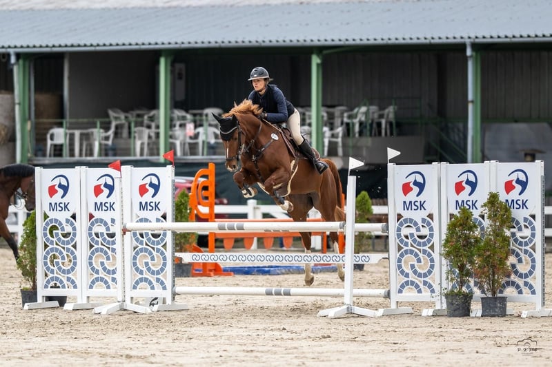 Schöne und auffällige Springstute mit Chrom, 5 Jahre alt, von Aristo (Artos x Carthago) aus einer Guidam-Tochter. Vorsichtig, nicht schreckhaft, erfahren bis 1,15 m, geradlinig, kooperativ und motiviert. Hervorragende Lady/AO/Jungpferd.