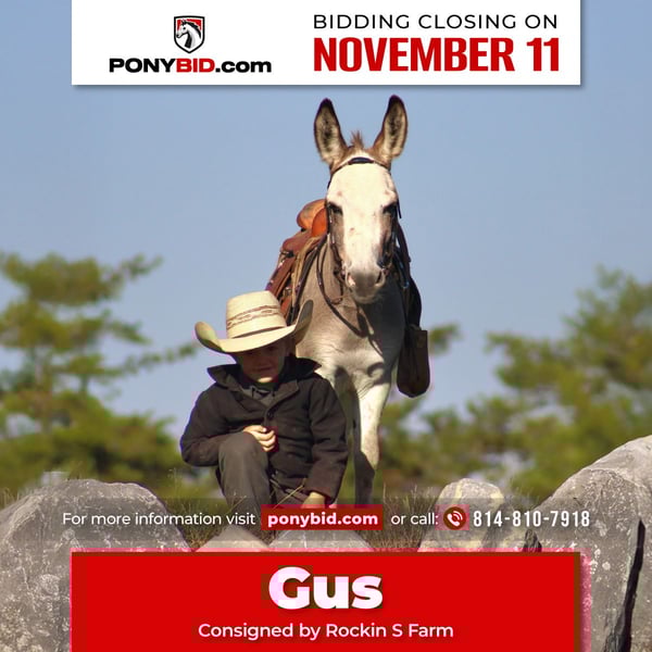 𝓽𝓱𝓮 𝐑𝐈𝐃𝐄𝐑'𝐒 𝓒𝓱𝓸𝓲𝓬𝓮 🐴 𝐏𝐎𝐍𝐘 𝐄𝐃𝐈𝐓𝐈𝐎𝐍 🐴 Happening now thru TUESDAY | NOVEMBER 11th - Available EXCLUSIVELY on Ponybid's website! For more details and to register visit: www.Ponybid.com CONSIGNOR CONTACT: Rockin S Farm 814-810-7918 LOCATION: Rebersburg, PA BREED: Miniature donkey REGISTERED: No COLOR: Spotted gray HEIGHT: 32" AGE: 6 GENDER: Jack ✨️✨️Gus✨️✨️ Here's a little dream donkey! The perfect age of 6yr old and broke to ride and drive, Gus is the perfect babysitter or the little ones 1st pony, he is the type that always takes care of his rider no matter what the situation , he trail rides like a dream and will lead or follow daddy's horse anywhere, We've taken him to state parks for trail rides and he did perfect, loads and trailers great with no issues, the children have been on 5 mile trail rides and we don't have to worry if they take this trusty guy out He's also been driven on the main road and traffic doesn't bother him, so whether you want to pull a cart or saddle him up he checks all the boxes. Gus gets along well with other horses and livestock in the barn or pasture, he is 100% sound and healthy with no vices or bad habits and ready for his new forever home! Gus is up-to-date on farrier and dewormer and has a current coggins and health certificate We are happy to assist in arranging transportation anywhere in the US If You have any questions please feel free to call Sam 814-810-7918