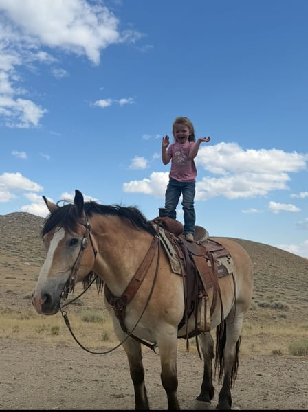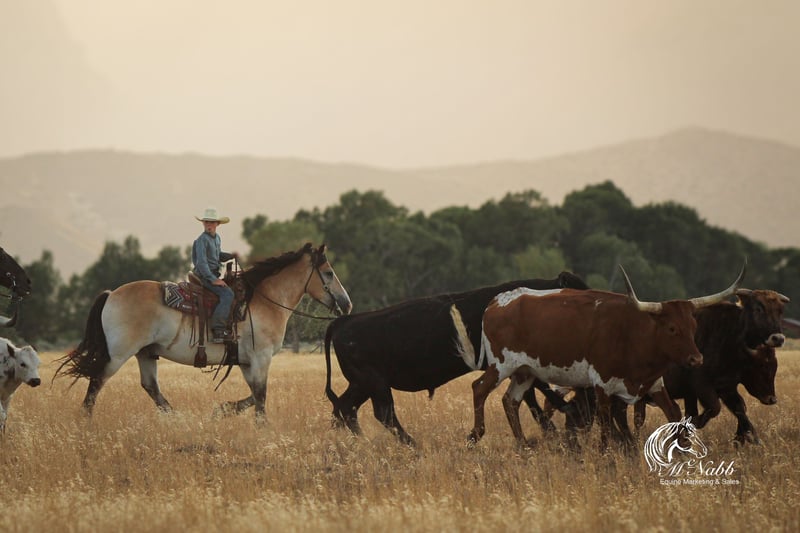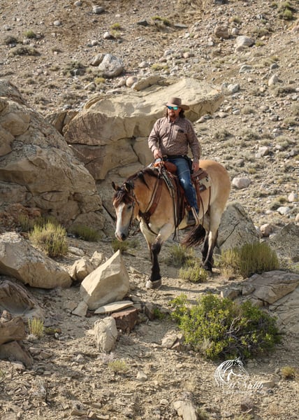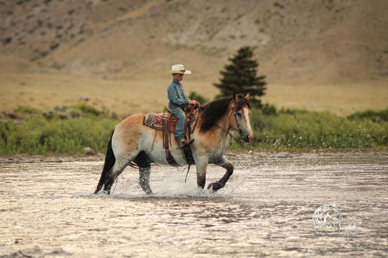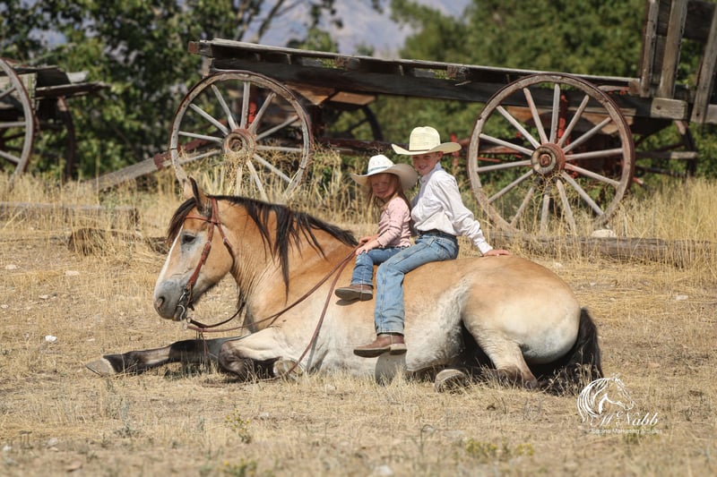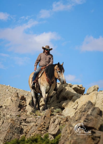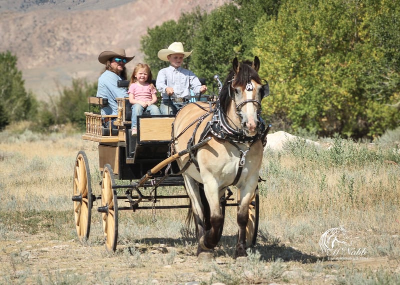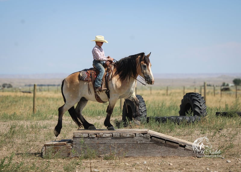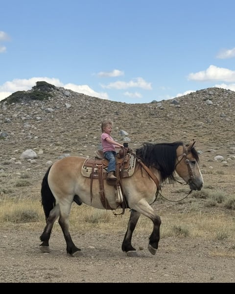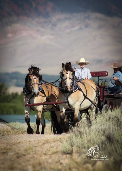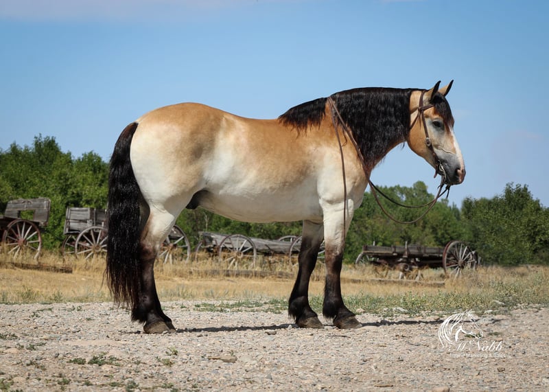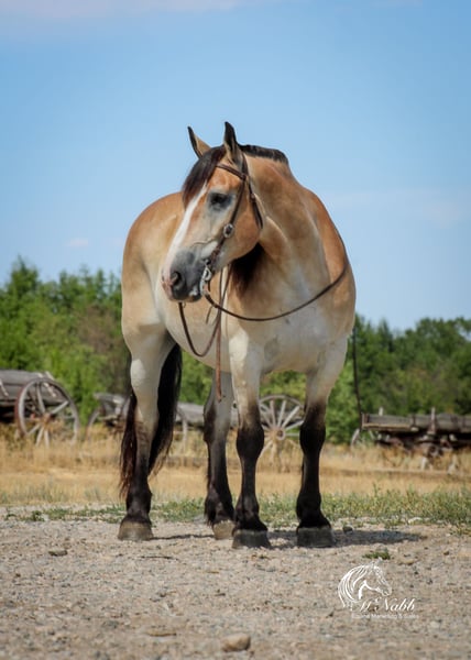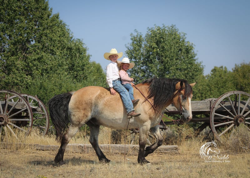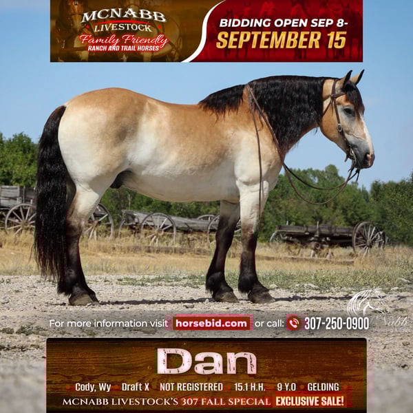 𝕄ℂℕ𝔸𝔹𝔹 𝕃𝕀𝕍𝔼𝕊𝕋𝕆ℂ𝕂's 🍂𝟑𝟎𝟕 𝐅𝐀𝐋𝐋 𝑺𝒑𝒆𝒄𝒊𝒂𝒍🍂 Happening now thru MONDAY | SEPTEMBER 15th - Available EXCLUSIVELY on HorseBid's website! For more details and to register visit: www.Horsebid.com CONSIGNOR CONTACT: McNabb Livestock LLC 307-250-0900 LOCATION: Cody, Wy BREED: Draft X REGISTERED: No COLOR: Buckskin HEIGHT: 15.1 AGE: 9 GENDER: Gelding Dan is one unique horse, he is such a cool color with that blond buckskin color. He is a Belgian X who is thick made excellent bone structure but is a nice height at 15.1 hands tall. He has that typically gentle, easy going personally of the draft horse. He is broke to drive both single and double. He also rides around very nice, he lopes good circles, knows his leads, has a good stop, and turn around. Dan is super smooth to ride. He has an easy rocking chair lope and very smooth trot. Dan is soft in the bride and rides off your legs. Anyone can ride or drive him. If you’re looking for that beginner horse to learn to ride or drive he your guy. He is easy to catch, hook by yourself. He stands quiet and patient to harness or saddle. My kids both drive and ride Dan and we don’t worry one bit about them being around him. We drive him with Tucker and as a team they are just as easy to handle and quiet natured. They both will ride or drive independently, not buddy sour. You can leave one standing tied or in the corral and take the other one out for a ride or drive and they both are happy. We are selling them as choice so you can buy either one or both of them. Out on the trial Dan is happy to just take a leisurely stroll anywhere you want to go. He’s seen miles in the mountains tail riding. We’ve used him around the ranch and he’s very willing to do anything you ask. He is also taught to lay down making him easy for anyone to get on. He has had a basic PPE, up to date on worming, dental and farrier. We welcome you to do your own PPE and to come to the ranch a to meet Dan. We also are glad to help arrange transportation. We will hold the horses at no charge for a reasonable amount of time to get hauling arranged. For more information call 307-250-0900.