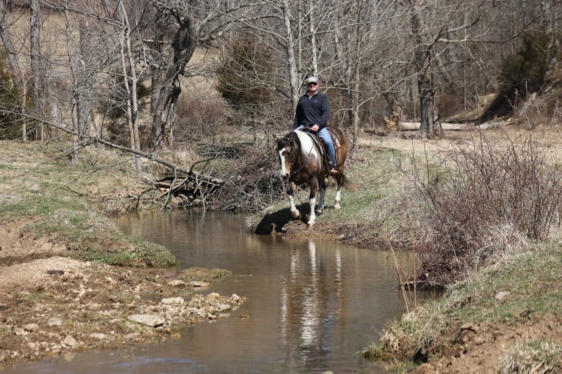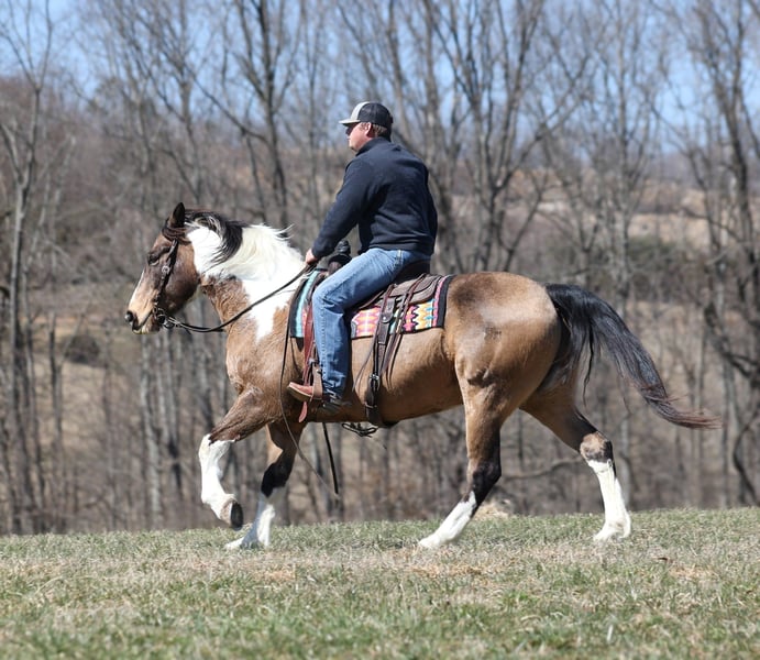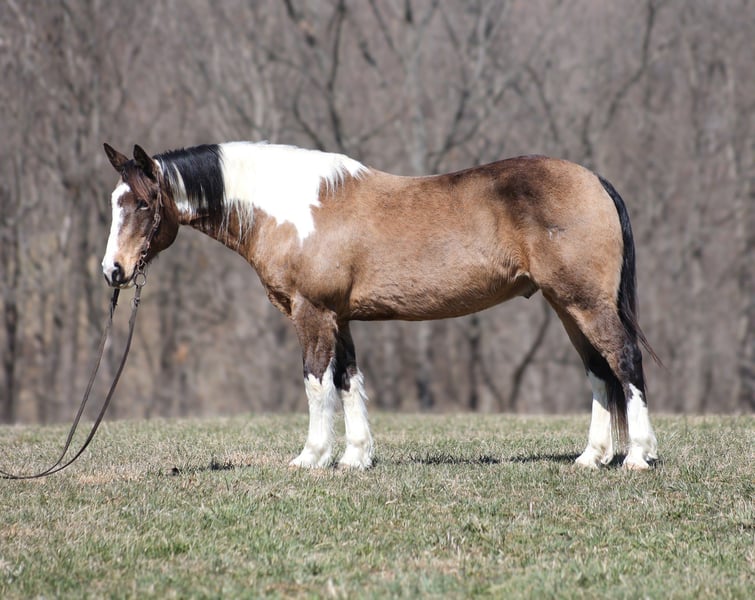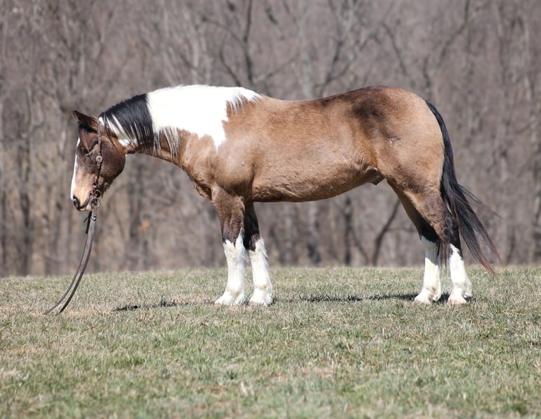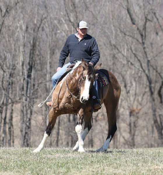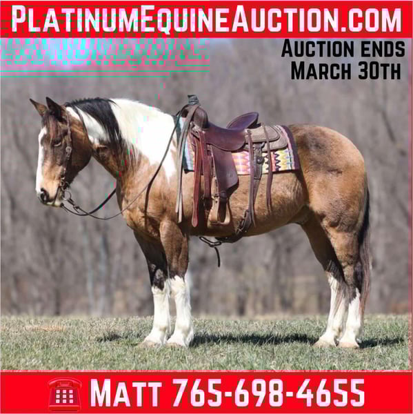 ONLINE AUCTION Place your bids at www.PlatinumEquineAuction.com Starting Bid $3500 Auction ends March 30th, 2025 Need a new saddle? Check out White Rock Saddles on our website or Facebook! Doc Holiday is a beautiful Buckskin Tobiano Paint Draftcross Gelding that is standing 15.1hh and he is a 11 years old! Doc is very stout built with a thick bone and big solid hoof, he is built for the long haul! Doc is a blue collar horse who has got up every morning and went to work making an honest living as a ranch horse. He has worked on a cow/calf operation, pasture roped/doctored/tagged. He has penned cattle at the sale barn and worked on a feedlot as well. Doc has lots of experience and is a well rounded horse that can go in any direction. He lopes nice slow circles, catches the correct leads, has a good stop and reins a circle each way. Doc is great on the trails and nothing phases him! He is content to mosey and loves going on trail rides. He will cross creeks, ditches, logs and navigate rough rocky areas. Doc has been exposed to all kinds of wildlife and will go anywhere that he is asked too. He has been rode many miles in the mountains and encountered every obstacle possible on the trail. He will go up or down even the steepest slopes, across deep creeks, over downed trees, and over all types of rough terrain while still being sure footed. Doc has been ridden down the highways and is traffic safe as well. If you want to cruise along down the trails or go out rope and tie one down Doc is a horse that will fit the bill! If you have any questions, would like to make a Buy It Now Offer or set up a Facetime Call, contact Lucky 13 Equine Matt 765-698-4655 or Lysandra 765-717-2041 Located in Brodhead, KY. ONLINE AUCTION Place your bids at www.PlatinumEquineAuction.com Starting Bid $3500 Auction ends March 30th, 2025 Need a new saddle? Check out White Rock Saddles on our website or Facebook!