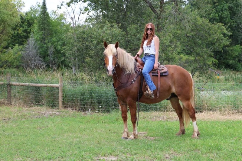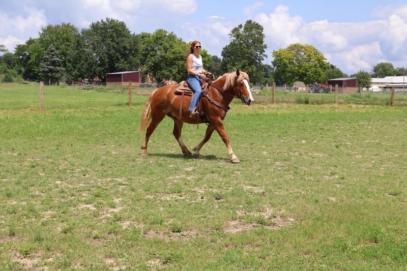 ONLINE AUCTION Place your bids at www.PlatinumEquineAuction.com Starting Bid $3500 Auction ends August 18th, 2024 Need a new saddle? Check out White Rock Saddles on our website or Facebook! Meet Cash! Here he is- big, quiet, middle age, and a gelding!! My phone rings daily for this type! Cash is the steady eddy, quiet, dependable, and safe mount that everyone is searching for. He is 16 hands & 12 years old. His mom is a haflinger and his dad is a Belgian draft. Cash is a handsome chestnut gelding with a long, thick blonde mane and tail. He is the type who is built to last. He is correct in every way; good bone structure, clean legs, proportionate body, and strong hooves. Cash is a joy to ride and is easy to get along with. He walks, trots, and canters on a loose rein and has wonderful breaks. Say “whoa” and he tucks in his hind end and comes to a complete stop. Cash has a nice steady way of going and is very agile for a horse of his size. He is generally in no rush to get anywhere. Cash takes his time and enjoys the views. Cash rides both English and western. He has done countless of trail rides and has been hauled out to all the state and to metro parks all in Michigan. This fall Cash did a few hunter paces with some of our staff members. He has seen plenty of miles on the dirt roads, open fields and deep woods. Water, wildlife, bikes don’t phase him at all. He jumps right around in true hunter fashion, slow and steady. He pops his knees up yet won’t shy from anything. He has lots of fancy buttons for the more advanced riders. He knows how to side passing, leg yield, pivoting, turn on the forehand and haunches in. He has competed under the lights in a grand stand performance in front of hundreds of people while keeping his cool. He has also completed our de-sensitization program with flying colors; flags, tarps, pool noodles, opening gaits roping- he’s seen it all. Cash has also been driven! He’s pulled out carriage in busy cities and just around the farm. We think Cash would do well as a lesson horse, family horse, trail horse, or a show horse. Cash is a horse anyone can ride, love, and enjoy! Located in Howell MI 48855. Call or text Ellesse Schwartz 248-390-6831 for more info. ONLINE AUCTION Place your bids at www.PlatinumEquineAuction.com Starting Bid $3500 Auction ends August 18th, 2024 Need a new saddle? Check out White Rock Saddles on our website or Facebook!
