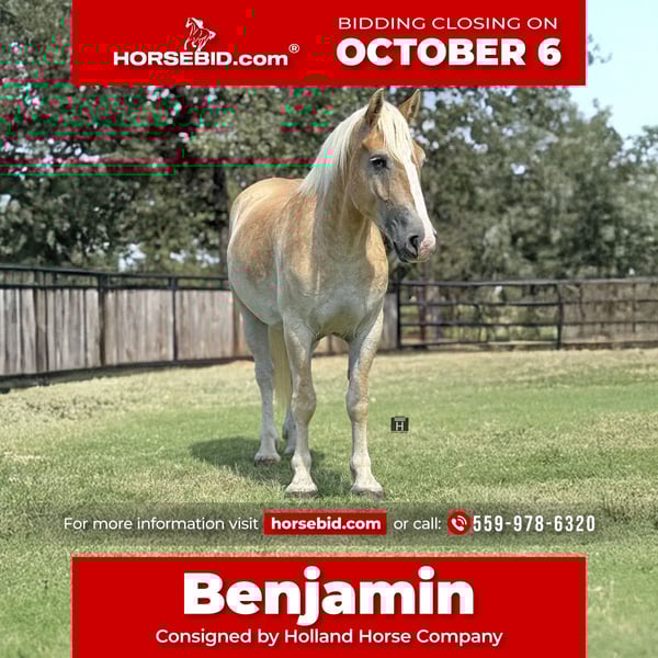 🍂 𝓐𝓾𝓽𝓾𝓶𝓷 𝑨𝑳𝑳 𝑺𝑻𝑨𝑹 𝑳𝑰𝑵𝑬𝑼𝑷 🍂 Happening now thru MONDAY | OCTOBER 6th - Available EXCLUSIVELY on HorseBid's website! For more details and to register visit: www.Horsebid.com CONSIGNOR CONTACT: Holland Horse Company 559-978-6320 LOCATION: Jacksboro, TX BREED: Draft Cross REGISTERED: No COLOR: Sorrel HEIGHT: 15.1 AGE: 3 GENDER: Gelding Benjamin Buttons, as we call him, is a young horse with an old soul. Benjamin stands 15.1 hands, weighs a solid 1250 and wears a size 3 shoe. He is safe, sound and a very handy crossbred gelding. We have used Benjamin out on the ranch, in the corrals, and in the arena roping, sorting and doctoring cattle. He will know a days work. Benjamin is started under English tack and fences and took to it instantly and easily. He is broke to drive both a cart and farm equipment. He is unphased by traffic and commotion. Benjamin is the perfect cross of athleticism and draft as well as woah and go. We feel he could fit most riders of all levels. Benjamin is friendly and easy to be around. He has good ground manners. He gets along well with others. He is the same horse every time you saddle him up. He’s super fun to ride and will try his best at anything you ask of him. Benjamin is sound, straight and clean legged. FMI call/text Chanel with Holland Horse Company 559-978-6320. We are happy to schedule a PPE, arrange a test ride or help find shipping nationwide!