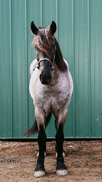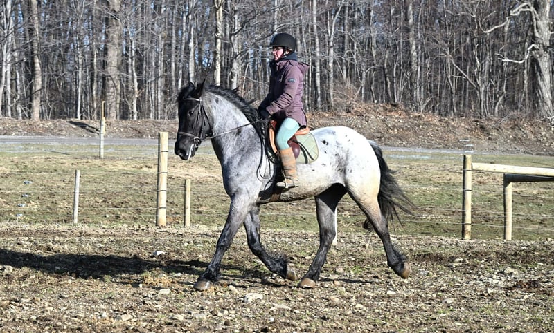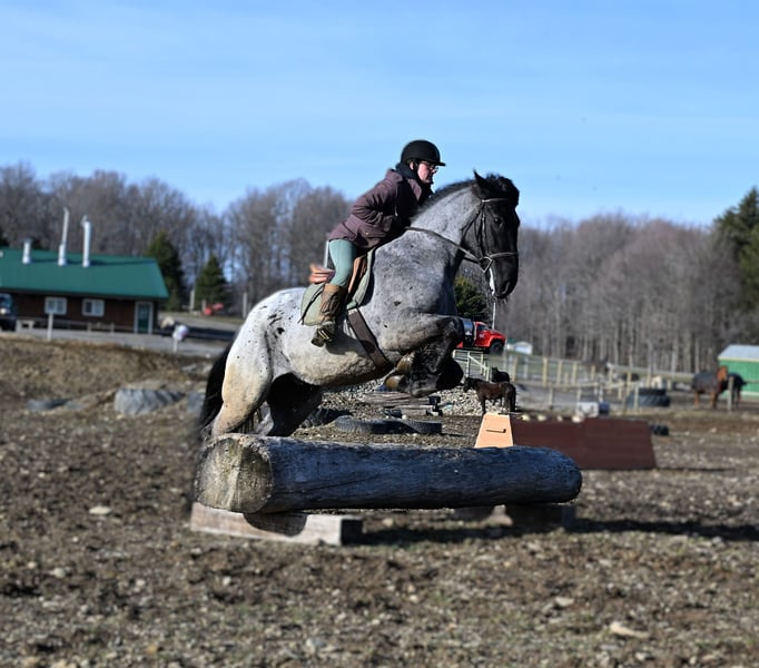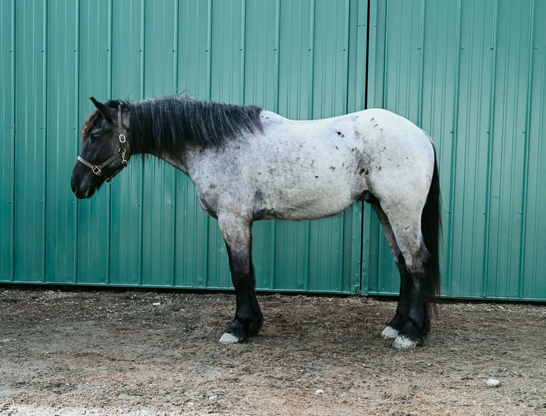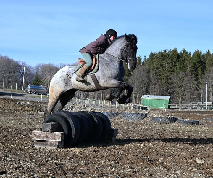 "AVAILABLE ON ONLINE HORSE AUCTION AT www DOT PlatinumEquineAuction DOT com BIDDING OPEN NOW thru SUNDAY | APRIL 12TH! *Final price will be determined on auction site* CONSIGNOR CONTACT INFO: Wolcott's Versatility Horses and Training 585-734-0169 LOCATION: Warsaw, NY **2 Week Guarantee** Meet Azur, a sharp-looking 4-year-old blue roan draft cross gelding standing 16.1h. He’s the kind that turns heads, but more importantly, he’s got the brain to match. Azur is sure-footed, brave, and takes everything in stride. He’s currently wearing shoes due to our terrain, but he has good, solid feet and clean legs. We’ve had him out on the obstacle course, and nothing seems to bother him; he’ll carry a flag, drag a tarp, and step over or through whatever you point him at without hesitation. He’s been used out on the trails both alone and in a group, and goes wherever you ask without a fuss. Azur is the type that wants to please and shows up with a good attitude every ride. He’s also been around plenty of wildlife, water, dogs, and farm equipment, all part of his normal day. On the ground, he’s easy to be around with good manners. He stands well for grooming, tacking, the farrier, and loads and trailers quietly. He gets along well with other horses and respects fencing. Happy in a stall or out in the pasture. Under saddle, Azur is a solid, comfortable ride with a nice walk, trot, and canter. He rides in a snaffle, stays soft in the mouth, and is easy to get along with. Azur has been used for our therapeutic riding program, and the riders all love him. Azur has been out fox hunting and on a low level eventing course. He stands for mounting and dismounting and knows how to take a joke. He has been in the arena with 15 other horses and doesn’t get bothered by other horses going by him. We have also used Azur for our sleigh rides this winter as a team, and he did an excellent job. If you’re looking for a young horse with a great start, a level head, and the kind of attitude that’ll take him in any direction, Azur is one you won’t wanna miss. Follow us on Facebook and our Website! Contact Dayton at 585-734-0169 for more information, located in Warsaw, NY.