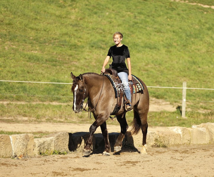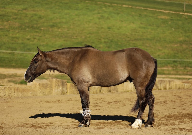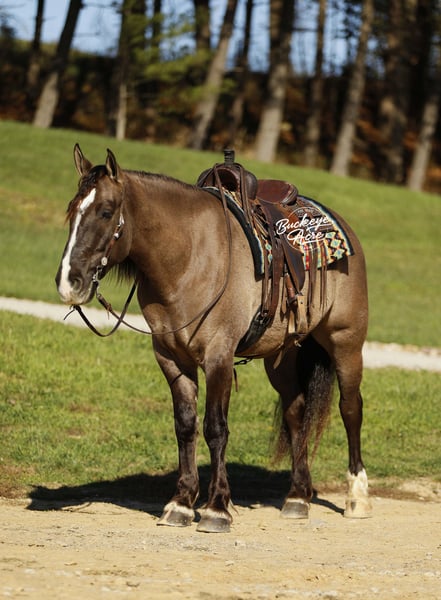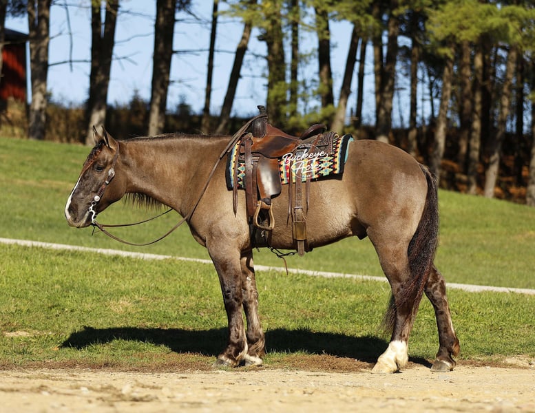 Meet Cheeko, a stunning 2021 grullo gelding with that rare, classy color, a soft white blaze down his face, and two neat white socks. Standing a solid 16 hands, he carries himself with presence yet stays a true calm, gentle soul through and through. Cheeko has seen a lot and handles each new place with confidence. He’s been down busy state roads in traffic, worked around cows, and helped check fence lines with no fuss. Out on the trails, he really shines — he’ll go uphill, downhill, over logs, across creeks, and through water without hesitation. He takes his time, stays sure-footed, and never gets bothered. Whether you want to ride the trail or just stay in one place to chat and enjoy the scenery, Cheeko is perfectly happy either way. He rides just as nicely in the indoor and outdoor arenas. He’s solid with jugs, tarps, whips, and gunshots, showing a quiet, steady mind every time. He has three smooth, balanced gaits — walk, trot, and canter — making him a pleasure for riders of many levels. You don’t have to ride him every day to keep him the same; he stays consistent, trustworthy, and ready to work. Cheeko also has some fun buttons: he’ll side pass right up to the mounting block and will even sit down or lie down on cue. Around the barn, he soaks up attention, enjoys grooming, and settles just as well in a stall as he does out in the pasture. Calm natured, kind, and dependable, Cheeko is the type that’s hard to find — a steady partner with all the looks, manners, and heart to match, whether you’re riding trails or just enjoying a peaceful moment together. If this sounds like the horse you’ve been looking for, please feel free to reach out to Duane @ 330-231-2324 for more info or to schedule a day to stop by and see him in person.