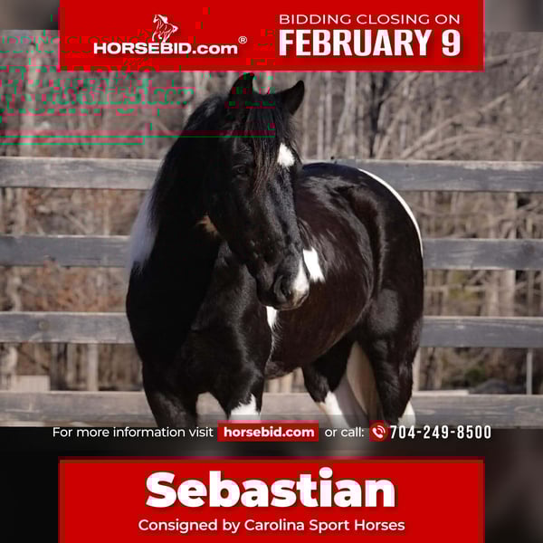 ❤️🔥𝑩𝒆 𝑴𝒊𝒏𝒆 𝐒𝐄𝐋𝐄𝐂𝐓❤️🔥 Happening now thru MONDAY | FEBRUARY 9th - Available EXCLUSIVELY on HorseBid's website! For more details and to register visit: www.Horsebid.com CONSIGNOR CONTACT: Carolina Sport Horses 704-249-8500 LOCATION: Clover, SC BREED: Draft X REGISTERED: No REGISTERED NAME: Sebastian COLOR: Black / White Tobiano HEIGHT: 14.1 AGE: 5 GENDER: Gelding Sebastian is a truly special Friesian Sport Pony who offers the rare combination of elegance, athleticism, and safety in a compact, user-friendly package. Standing 14.1 hands, Sebastian is fancy and refined, yet incredibly kind and approachable, making him a standout for a wide range of riders. In the ring, Sebastian shines. He is beautifully schooled, has his flying changes, and is fun and confident over jumps. He brings a smooth, balanced feel that makes him a joy to ride, whether flatting or jumping. His athleticism carries seamlessly into cross-country, where he eagerly takes on new challenges with confidence and a great attitude. Despite his talent and presence, Sebastian remains safe and easy to ride. He is large and capable enough for moms and trainers to school, yet gentle and forgiving for young riders. His height and quiet nature also make him an excellent option for a senior rider, as he is easy to mount and comfortable to ride. Sebastian’s personality truly completes the package. He loves attention, enjoys grooming, and is a pleasure to have in the barn. He has a wonderful demeanor and a people-oriented attitude that makes him as enjoyable on the ground as he is under saddle. If you’re searching for a fancy, versatile, and safe sport pony who can do it all — from ring work and jumping to cross-country fun — Sebastian is an exceptional choice. *All of our descriptions are OUR OPINION and ARE NOT FACTS. They represent how the horse responded and behaved while in our care. Horses can change at any time as they are living, breathing animals. There are no warranties expressed or implied via the descriptions above*PLEASE READ OUR BUYERS GUIDE PRIOR TO BUYING OR BIDDING ON ANY HORSE WE HAVE AVAILABLE. Interested in bringing Sebastian home? Give us a call today! Please take the time to read our Buyers Guide to answer any questions or concerns you may have. Contact Us Call or TEXT 704.249.8500