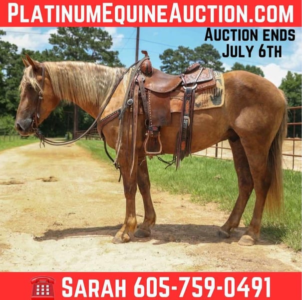 ONLINE AUCTION Place your bids at www.PlatinumEquineAuction.com Starting Bid $3500 Auction ends July 6 2025 Need a new saddle? Check out White Rock Saddles on our website or Facebook! Toffee is a 4 year old halflinger quarter horse cross gelding. Standing 14.3 hands tall and cute as a button, he is sweet, smart and willing to learn! Toffee has the gentle quiet demeanor of a halflinger and has the brains and ability of a quarter horse making him a super cool cross! Toffee has been trail rode extensively, he crosses the creeks, logs, and bridges and does everything with a willing attitude! Toffee has been rode in the mountains and has also been packed on, he is quiet minded and handles new things well! He also has a good foundation in the arena and is soft in the face and aims to please, he has a nice soft stop and will lope out nice as well! Toffee has been rode all different levels and ages of riders and is suitable for most anyone! If you’re looking for a super cool prospect, family horse or trail horse be sure to check Toffee out! He is located in Rusk TX, nationwide shipping is available! Call or text Sarah Kruger 605-759-0491 for more info or to set up a time to come meet Toffee! ONLINE AUCTION Place your bids at www.PlatinumEquineAuction.com Starting Bid $3500 Auction ends July 6 2025 Need a new saddle? Check out White Rock Saddles on our website or Facebook!