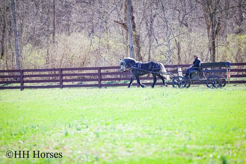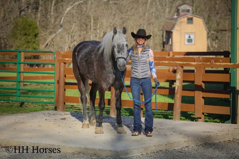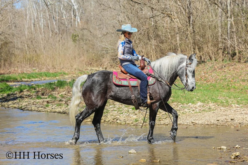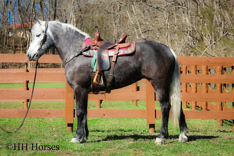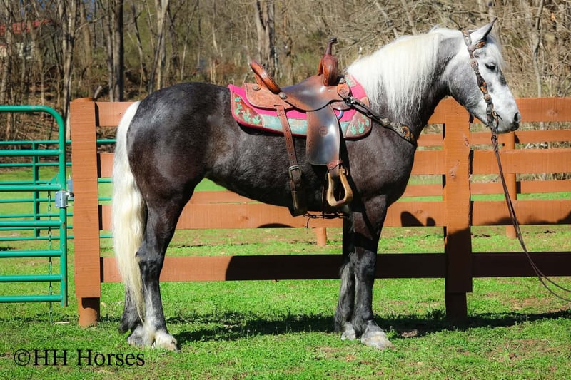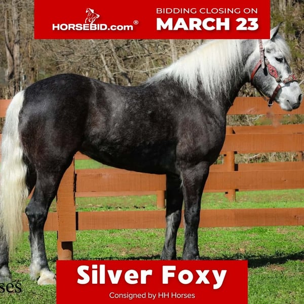 ⚜️𝓽𝓱𝓮 𝐆𝐎𝐋𝐃 𝓢𝓮𝓵𝓮𝓬𝓽⚜️ Happening now thru MONDAY | MARCH 23rd - Available EXCLUSIVELY on HorseBid's website! For more details and to register visit: www.Horsebid.com CONSIGNOR CONTACT: HH Horses 304-238-4155 LOCATION: Flemmingsburg, KY BREED: Draft Cross REGISTERED: No COLOR: Grey Dapple HEIGHT: 15.2 AGE: 5 GENDER: Mare This is "SILVER FOXY", a real attractive, gentle, well broke PERCHERON MORGAN CROSSBRED MARE that is broke to ride and drive. This mare oozes eye appeal. This mare has been trail ridden extensively, she has been through the cross country driving courses, and she aims to please. She stands a stocky 15.2 hands tall, she is 5 year old, and is a gorgeous dark silver dapple with a white mane, foretop, and tail. She has excellent ground manners, she stands to tack, harness, hitch, mount, and groom. She rides and drives out alone with no fuss, she goes anywhere you point her, and is extremely brave and confident. She is not marish, she gets along well with other horses, and she does whatever is asked of her with a can do attitude. She has pulled carts, wagons, and been hooked to farm machinery. She can carry a heavy rider and haul a heavy load under harness. She is sturdy and strong, yet gentle and easy to manage. She is user friendly, traffic safe, and not spooky. She lopes off with no hump and no buck. This mare is extra special with her coloring, her ride, her drive, and her personality. Don't miss out on a real unique and versatile horse.