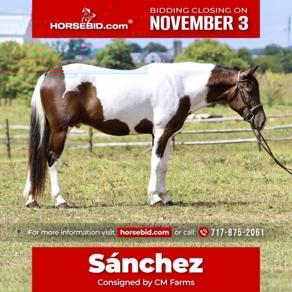 ⚜️𝐓𝐇𝐄 𝐅𝐀𝐋𝐋 𝐇𝐄𝐑𝐈𝐓𝐀𝐆𝐄 𝐂𝐋𝐀𝐒𝐒𝐈𝐂⚜️ Happening now thru MONDAY | NOVEMBER 3rd - Available EXCLUSIVELY on HorseBid's website! For more details and to register visit: www.Horsebid.com CONSIGNOR CONTACT: CM Farms 717-875-2061 LOCATION: Gap, PA BREED: Draft/Paint X REGISTERED: No REGISTERED NAME: Sánchez COLOR: Tri Paint HEIGHT: 15.1 AGE: 4 GENDER: Gelding Meet Sánchez, a 4-year-old, 15.1–15.2hh Draft/Paint cross gelding, a.k.a. Mr. Adorable Tank on Four Legs. This compact cutie is built like a brick house and has the personality of your favorite golden retriever. He’s the kind of horse that makes you smile every time you see him — and he knows it. He’s got solid conformation, like “could survive the apocalypse” solid, but without being a skyscraper. He’s the perfect height for those of us who like our horses to be sturdy and substantial — but not so tall that you need a parachute to dismount. He takes up leg beautifully and rides both English and Western, because why limit yourself? In the arena, Sánchez is that magical combination of comfy and uncomplicated. He stands patiently to be mounted — block, ground, whatever — and once you’re on, he’s got a walk-trot-canter that feels like riding a couch made of clouds. His trot is easy to sit (yes, really), and his canter? So smooth you’ll forget about your to-do list and start planning your next trail snack. He’s got a shorter stride, which means tight circles are no problem — and you won’t feel like you’re driving a stretch limo. He’s responsive, but not reactive — just the right mix of “let’s go” and “chill out.” You don’t have to constantly nag him to move, but you can put a leg on without getting launched into space. He stops like a pro with a little seat and a “whoa,” and his brakes work better than most luxury cars. Sánchez is basically the Swiss Army knife of horses. Want to dabble in dressage? Go for it. Try some jumping? Sure. Hit a hunter pace? Absolutely. Or maybe you just want a best buddy for trail riding and barn gossip — he’s your guy. On the trail, he’s a total gem. Front, middle, back, solo — you name it. He’s been through creeks, rivers, woods, and wide-open fields like he’s auditioning for a nature documentary. He’s brave, steady, and probably more reliable than your GPS. He’s even taken beginner riders out for a spin and kept things cool, calm, and collected. He’s popped over tiny logs in the field like a saint, knees up, ears forward, and zero drama. This guy loves going new places — he’s basically the horse version of that friend who always has their bag packed for a weekend trip. Load him up, and he’s ready to go, ears perked and wondering if there will be snacks. Desensitization? Oh, he’s done it all. Fire? Check. Traffic? No problem. Tarps, balls, smoke bombs? Bring it on. While he’s not a total deadhead (he does have a brain), he’s not spooky — more curious than anything. If something startles him, he does a little blink, shrugs it off, and keeps on trucking. In the barn, Sánchez is a gentleman. He minds his manners, respects your space, and plays nicely with the other horses. He stands like a champ for grooming, tacking, and farrier visits. He picks up his feet without fuss and never turns into a pushy brat. At first, he might seem a little stoic — like a mysterious cowboy in a movie — but give him a minute, and suddenly he’s your best friend, rooting through your pockets for peppermints like a seasoned treat detective. We truly love this young guy and believe his future is super bright. That said, he is still young and learning, so he probably isn’t ideal for a complete beginner unless they’re working with a trainer who can help guide him on his path to world domination — er, success. We want a home for him where he’ll be appreciated, loved, and maybe occasionally spoiled with cookies. Because let’s be honest — this horse is kind of amazing.