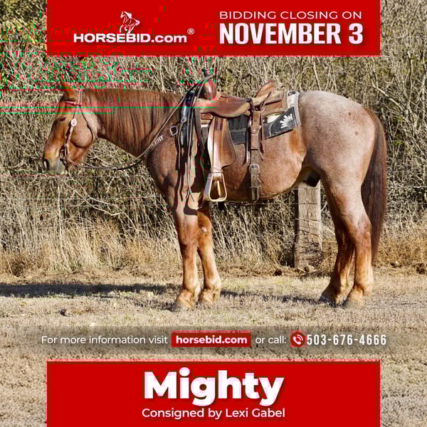 ⚜️𝐓𝐇𝐄 𝐅𝐀𝐋𝐋 𝐇𝐄𝐑𝐈𝐓𝐀𝐆𝐄 𝐂𝐋𝐀𝐒𝐒𝐈𝐂⚜️ Happening now thru MONDAY | NOVEMBER 3rd - Available EXCLUSIVELY on HorseBid's website! For more details and to register visit: www.Horsebid.com CONSIGNOR CONTACT: Lexi Gabel +1 (503) 676-4666 LOCATION: Stickney SD BREED: Draft cross REGISTERED: No REGISTERED NAME: Mighty COLOR: Red roan HEIGHT: 16 AGE: 4 GENDER: Gelding Mighty is a 4 year old 16 hand draft cross gelding. Mighty has a great start been used by a great Amish trainer, really rides around nice, lopes circles stops hard soft and very willing super athletic and very nice to be around, no silly business about him, with no buck rear kick or bite, he is good for farrier, saddles and bridles good, good with other horses and ponies, he is good around dogs and equipment, 100% sound with no blemishes, he is a super cool young gelding ready to make a performance horse or gentle enough to make a super nice trail horse. Consignor: Lexi Gabel +1 (503) 676-4666