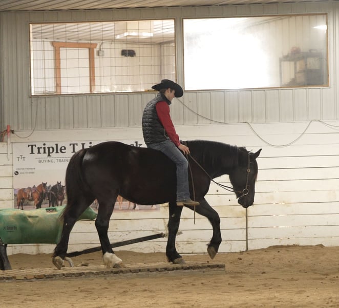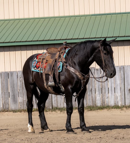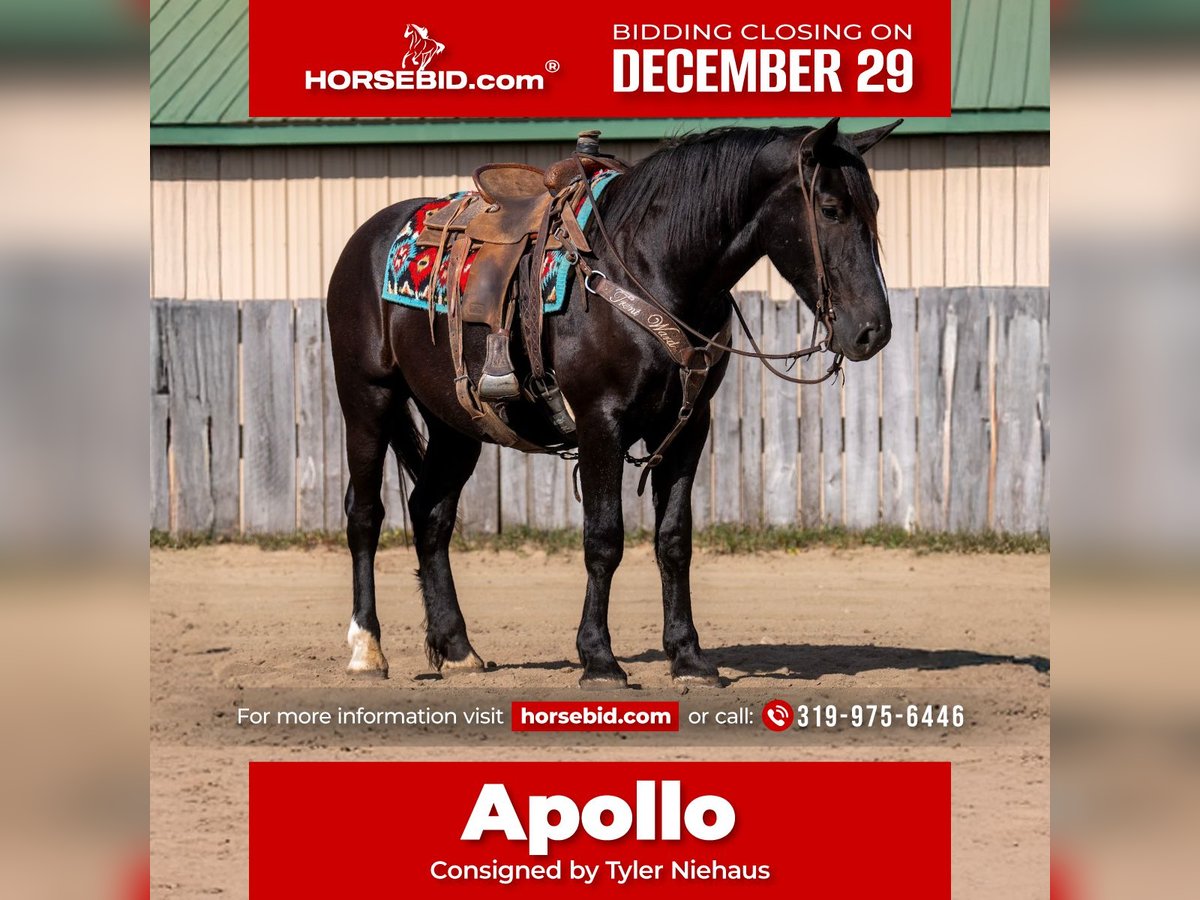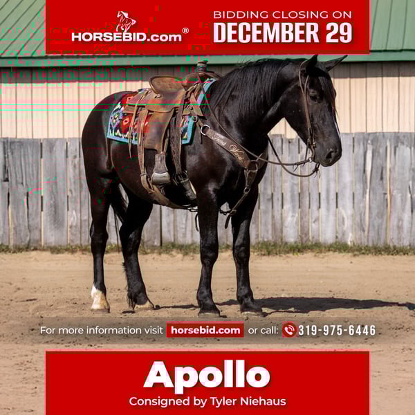 ⚜️ 𝓗𝓮𝓻𝓲𝓽𝓪𝓰𝓮 𝐖𝐢𝐧𝐭𝐞𝐫 𝓒𝓵𝓪𝓼𝓼𝓲𝓬⚜️ Happening now thru MONDAY | DECEMBER 29th - Available EXCLUSIVELY on HorseBid's website! For more details and to register visit: www.Horsebid.com CONSIGNOR CONTACT: Tyler Niehaus 319-975-6446 LOCATION: Nevis, MN BREED: Draft Cross REGISTERED: No COLOR: Black HEIGHT: 16.1 AGE: 4 GENDER: Gelding Apollo is a handsome 4-year-old draft cross gelding standing 16.1 hands, offering an impressive combination of size, versatility, and a kind, willing temperament. He is broke to both ride and drive, and can be driven single or double, making him a well-rounded partner for a variety of uses. Apollo saddles and harnesses easily, handling new situations with a calm, cooperative attitude. He is gentle, kind-eyed, and eager to please, the type of horse that builds confidence in his handler. Traffic safe and level-headed, he is equally comfortable out on the road, on the trail, or hitched for a relaxed family sleigh ride. Despite his size, Apollo is easy to mount thanks to his ability to curbside. Whether you’re using a mounting block, a picnic table, or even a fence, he stands patiently and makes getting on simple and stress-free. With his steady nature, versatility, and agreeable disposition, Apollo is a dependable and enjoyable companion for both work and leisure.