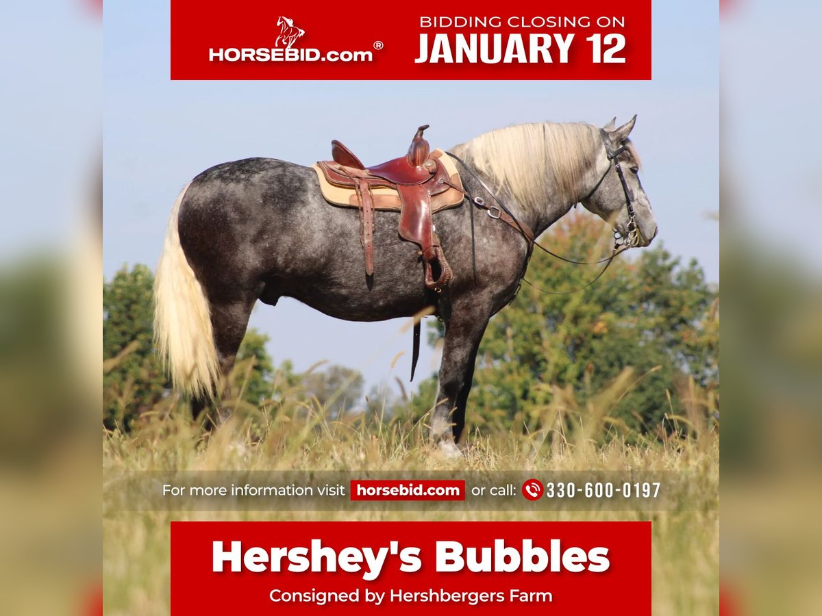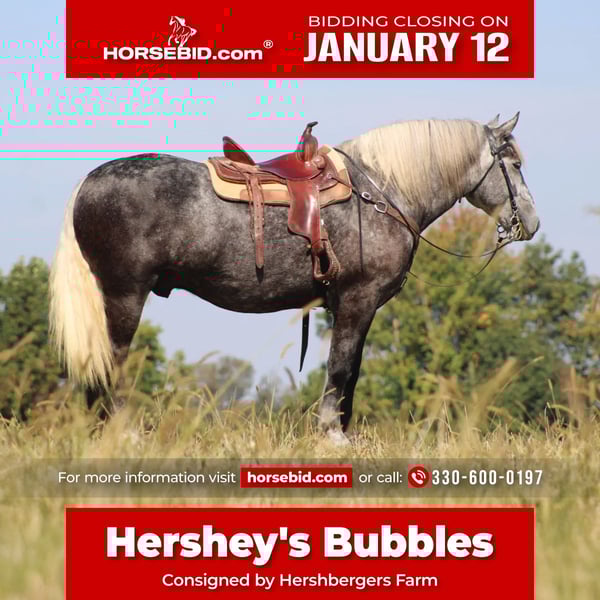 ♦️𝐍𝐄𝐖 𝐘𝐄𝐀𝐑'𝐒 𝑬𝒙𝒕𝒓𝒂𝒗𝒂𝒈𝒂𝒏𝒛𝒂♦️ Happening now thru MONDAY | JANUARY 12th - Available EXCLUSIVELY on HorseBid's website! For more details and to register visit: www.Horsebid.com CONSIGNOR CONTACT: Hershbergers Farm 330-600-0197 LOCATION: Millersburg, OH BREED: Draft Cross REGISTERED: No REGISTERED NAME: Hershey's Bubbles COLOR: Dappled Grey HEIGHT: 16.1 AGE: 5 GENDER: Gelding Meet Hershey's Bubbles!!! Bubbles is a once in a lifetime find that will get along with just about anyone. He is 5 years old and is a 3/4 Percheron and 1/4 Quarter Horse. Hershey's Bubbles is about as BOMB PROOF and safe as you can find a horse!! His sweet attitude in the barn and his willingness on a trail ride will please anyone. He is absolutely traffic safe and on trails he will step over logs and go through streams with no issues. Bubbles picks up both leads and has been ridden English, Western, or bareback. At 4 years old Bubbles is very mellow and safer then most horses. He has been used here to give rides and also has been in our petting area a lot. He is very gentle with kids and is sure not to nip their fingers when they feed him carrots. Bubbles has been driven single a lot as well as double with another horse. Bubbles has absolutely no fear and will go through whatever you point him at. He is the type of horse that if you can climb on his back you can ride him. It doesn't matter if you use him once a month or every day he will always be the same. He stands nice to tack up and to mount. Bubbles also comes running up to the gate when you whistle at him when he's out in the pasture. He does great at picking up his feet and also loves getting a bath. His beautiful color grabs everyones attention as he goes by. He's been Downtown on busy highways and there is no truck big enough to spook him. If you like a pretty horse and if safety means anything to you, you just can't afford not to have a horse like Hershey's Bubbles!!!! To learn more about Bubbles call or text 330-600-0197.