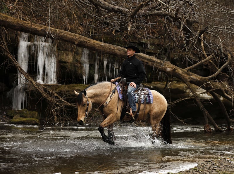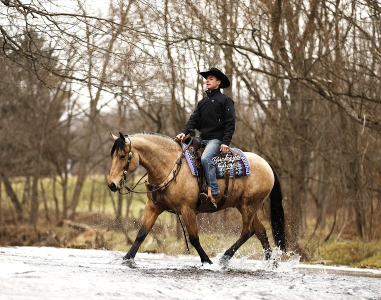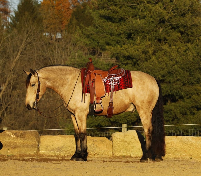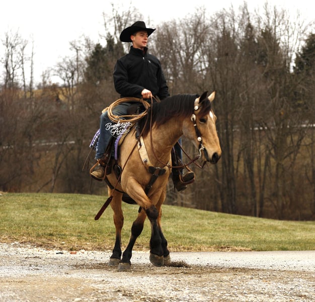 Whew, wow—where do we even begin with Martini? This extraordinary buckskin Draft/Quarter Horse cross is truly a one-of-a-kind package, combining stunning color, perfect confirmation, a gentle personality, and a presence that will win your heart. Born in 2020, Martini stands a strong 15.1 hands, highlighting a beautiful, dappled buckskin coat, a long, flowing mane and tail, four striking black socks, and a small white star centered perfectly on his forehead. Wherever he goes, he turns heads—whether it is in the pasture or out on the trail. Martini is not just a pretty face—he is a true gentleman with a heart as big as his presence. His personality is kind, patient, and eager to please, making him a joy to be around in the barn, pasture, or arena. He has an exceptionally good “must feel” and smooth, enjoyable gaits that you can sit in all day without even noticing you are riding—making every ride an effortless and relaxing experience. Versatility is one of Martini’s strongest qualities. He has been ridden Western, English, and bareback, and can side-pass with ease. He takes jugs, whips, and tarps in stride without hesitation and adapts to any situation with confidence and calmness. From state roads with traffic to checking cows on the ranch, and from exploring miles of trails through woods, over logs, and across streams, Martini never misses a beat. He is as comfortable in the indoor arena as he is in the great outdoors, always maintaining his composure and willingness to work. Martini is also incredibly safe for riders of all levels—whether you are a beginner, a senior, or an advanced rider, he will take care of you and make every ride enjoyable. He shines as a reliable and easygoing partner off the saddle as well. He is a gentleman in the barn and pasture, always the first to greet you at the gate, and he is excellent with farrier visits, wash bay routines, and general handling. He does not require daily rides to stay consistent in manners, attitude, or performance, making him an ideal mount for busy owners or those looking for a horse with no maintenance needs. On top of his personality and experience, Martini has all the practicalities covered: he is up to date on vaccinations, deworming, and shoeing, and has proven to be sound, healthy, and dependable. His combination of beauty, brains, heart, and versatility makes him equally suited for trail riding, ranch work, casual pleasure riding, or showing in a variety of disciplines. If you have been searching for a horse that combines stunning looks, smooth gaits, kind temperament, and a lifetime of experience, Martini might just be the one. He is more than a horse, he’s a partner, a friend, and a trusted companion ready to create memories for years to come. Reach out to Duane at 330-231-2324 to learn more or schedule a visit to meet this amazing horse in person.