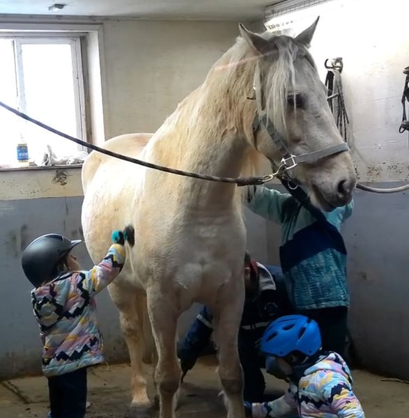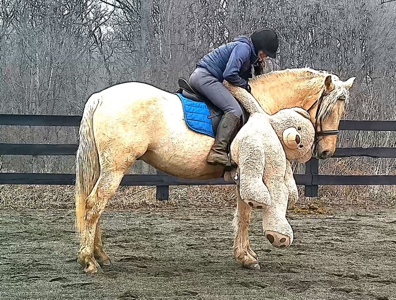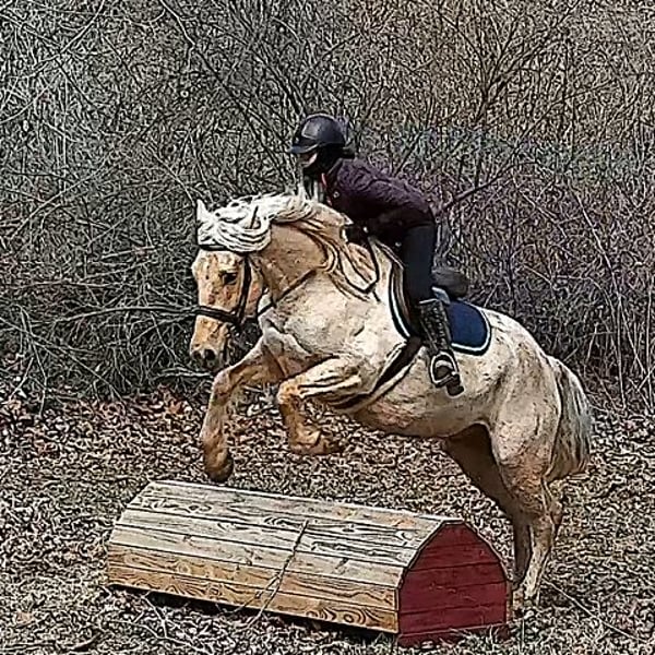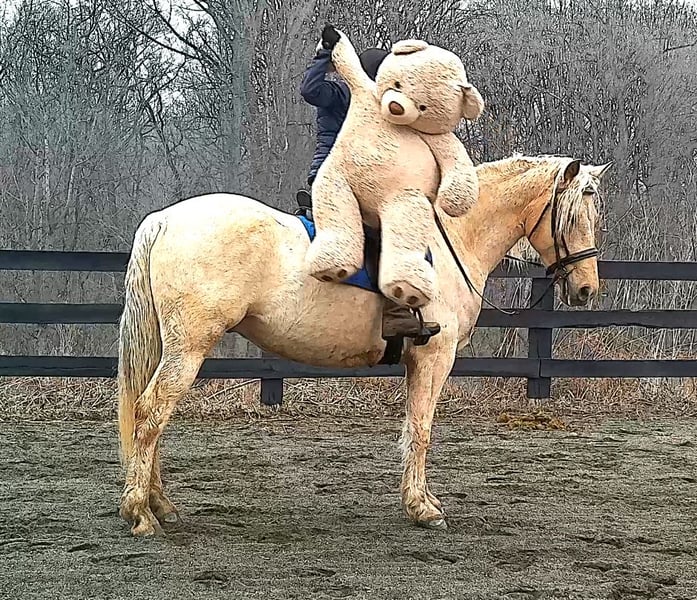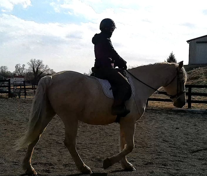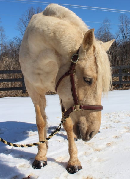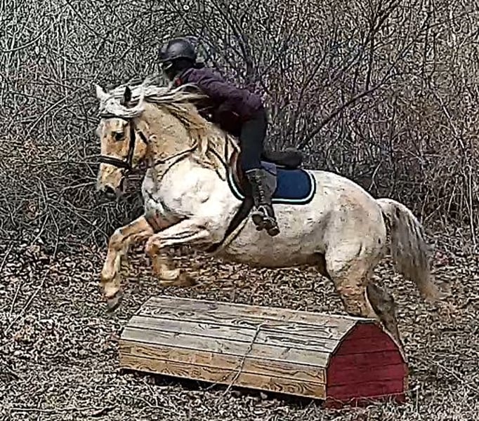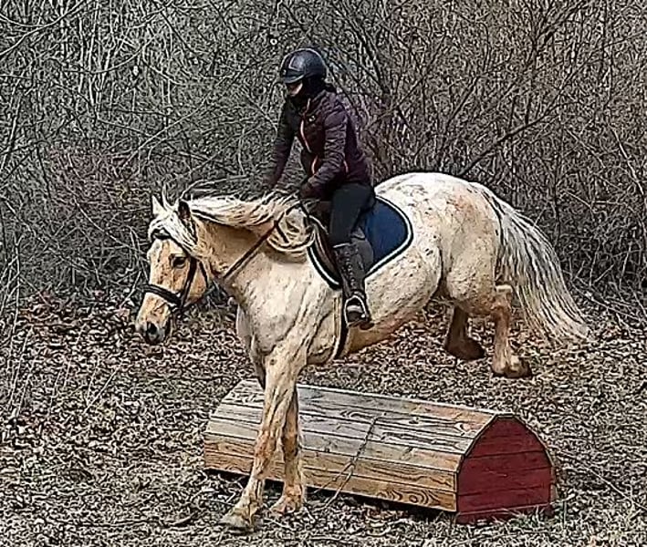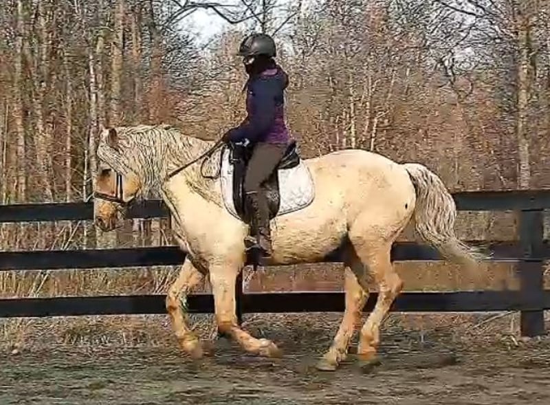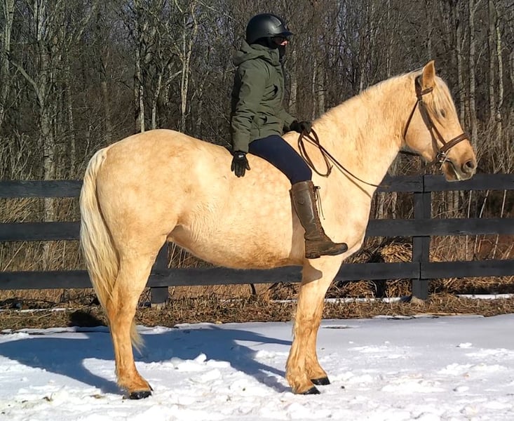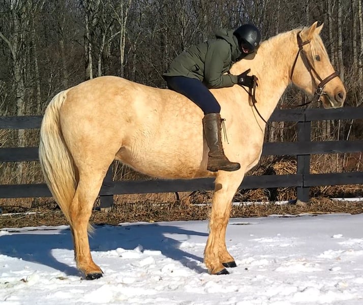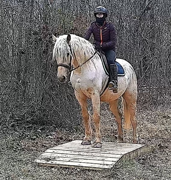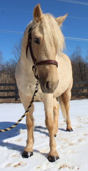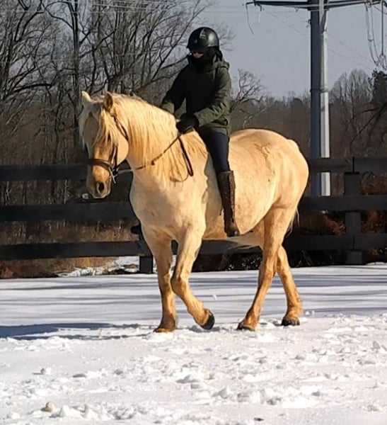 "AVAILABLE ON ONLINE HORSE AUCTION AT www DOT MagicHorseAuction DOT com BIDDING OPEN NOW thru TUESDAY | MARCH 17TH! BUY IT NOW AVAILABLE! *Final price will be determined on auction site* CONSIGNOR CONTACT INFO:Nicole Ingrassia #571-289-2947 LOCATION: Jeffersonton, VA" "Are you looking for the ultimate dream horse? Meet Mellow Yellow! Mellow is a spectacular and rare cream-colored 6 year old draft cross gelding with long, naturally wavy mane and tail, and a stunning creamy golden coat that dapples out to create a unique dappled palomino color. His hair is naturally thick and wavy all on its own, with a cascading forelock that reaches his noseband and a wavy tail that glistens off the sun even in the drab grey of winter. He stands approx. 15.3H with a thick & correct build yet he is light on his feet and agile particularly for a draft cross. If his looks aren't enough to completely captivate you, zoom your gaze out to take in his correct build, sporting large, sturdy, strong bare feet that don't require shoes, even when we have trail ridden him over rocks, mud, snow, and ice and on paved and unpaved roads. Check out his long, beautifully arched neck, wide chest, strong hind end, straight legs, sporty shoulder and total absence of any notable blemishes. Meet his kind, warm brown eyes, affectionately poking out from behind his wavy forelock, eager to greet you like man's best friend and happy to go on the adventures you have planned for that day. Then look at him in motion - check out his flatkneed trot with its beautiful reach, the ease of sitting it because it is so smooth and comfortable and, well, easy! Posting is optional and his trot is very easy on your back, so easy even a 5 year old child can sit his trot with no stirrups (please see video). Check out the same for his canter, how it rolls from the hind end and is so easy, pleasant, rhythmic and idyllic. The icing on this horse cake is that Mellow has a loving, goofy, fun personality, and an unflappable type nature, making him the perfect all-arounder for a multitude of jobs and a fun horse to be around and spend time with. All in all, Mellow is a quality specimen who also possesses an undeniably unique, gorgeous look that stands out among the most discerning and distinguished of standards, while he also has an ""every day"" attitude that fits a horse suitable for many different people and families. In other words, Mellow can be your fancy show horse OR your lifelong family horse, or your horse to enjoy your golden days of retirement with, or your returning to riding and need a sane buddy horse, or a foxhunting partner, or, what can you think of? Because Mellow is very versatile and possesses brains, beauty, talent, and personality all wrapped up in one horse. Dress him up or dress him down, he is suitable for a wide variety of things and is a happy-go-lucky calm-minded heart throb. Mellow is very true to his name and possesses a calm and steady temperament. I have never once seen him buck or rear and he is not a spooky type of horse. In fact, during the great icing of this past winter, Mellow was up in the barn for most of the month due to the icing of his hilly pasture. After having almost 3 weeks off and being cooped up in subfreezing temperatures, when most horses would be losing their mind, his very first ride back I rode him bareback in the snow (as seen on video). To say he needs no lungeing or prep is an understatement, in my opinion. He was also ridden by small children around that time. Despite his steady, calm temperament, Mellow is no plug when asked to work, and he will happily jump fences, hack out, and moves off the leg nicely and smoothly and seems to enjoy dressage as well. Mellow loves to jump and is a total natural over fences, and has jumped a variety of fences both inside and outside the arena. He would make the most amazing fox hunting horse or trail rider, dressage horse, event horse, or really suit a wide variety of athletic disciplines or be content to be a beautiful & cherished family horse. If you are looking for a horse that possesses both brains AND rare beauty, he is just the ticket you've been waiting for. Mellow has a great start in a broad manner (western, jumping, dressage basics, kids riding, trails both alone & in company, exposed to flags, whips, tarps, bouncy balls, long lines/ground driving, XC jumping, bareback, crosses water, riding double, ships around with ease, etc.) so he can continue in any direction you choose -- he has the brains, beauty and the talent -- to make that winning combination. Mellow is very friendly and absolutely loves any attention he can get. He is very much ""in your pocket"" with a willing to please disposition and not a mean bone in his body. He radiates kindness and is a horse any family would be proud to call their own. He is well-behaved for the vet & farrier. He is easy to have around the barn & farm, he is happy to be turned out or in a stall. He has no vices and no stall vices and he is not overly messy in his stall. He is not on grain as we choose to not grain our horses unless they need it. He gets a ration balancer for vitamins. He gets along well with both mares and geldings in turn out. He gets free choice hay and is easy to have around, comes up to you in the pasture and has not displayed herd bound behaviors. He loads onto a trailer without issue. He stands nicely to be bathed and picks up all his feet. We have not noticed any ""quirks"" while handling him and he is used to kids, dogs, chickens, tractors, ATVs, cats, and cows, etc. Mellow is not on any maintenance and is UTD on vaccines, dental, coggins, deworming & farrier. His age of 6 years old is verified by vet & equine dentist. Mellow is eligible for registry with the American Warmblood Society & Sporthorse Registry if his new owner desires. He has no health or soundness issues and is 100% sound and healthy with no notable scars, blemishes, or prior injuries. As a courtesy, he has a recent vet exam 