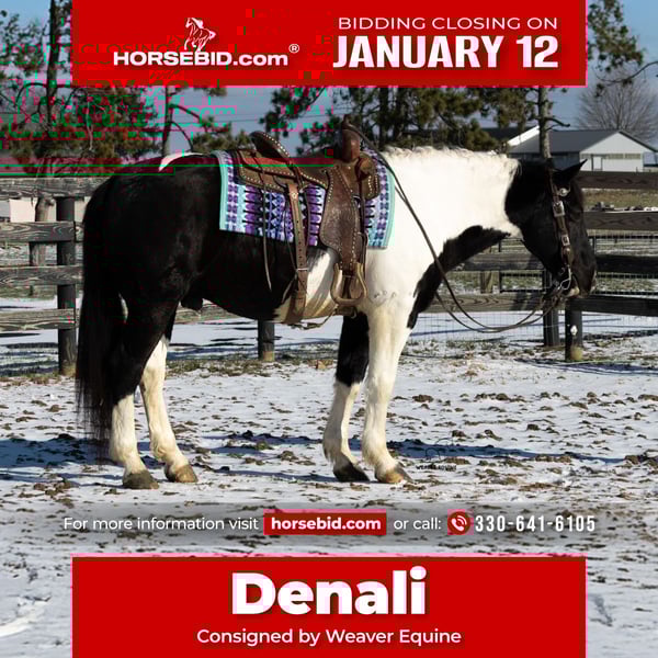♦️𝐍𝐄𝐖 𝐘𝐄𝐀𝐑'𝐒 𝑬𝒙𝒕𝒓𝒂𝒗𝒂𝒈𝒂𝒏𝒛𝒂♦️ Happening now thru MONDAY | JANUARY 12th - Available EXCLUSIVELY on HorseBid's website! For more details and to register visit: www.Horsebid.com CONSIGNOR CONTACT: Weaver Equine 330-641-6105 LOCATION: Fredericksburg, OH BREED: Draft paint cross REGISTERED: No REGISTERED NAME: Denali COLOR: Paint HEIGHT: 15.3 AGE: 6 GENDER: Gelding Denali is a gorgeous black and white painted draft cross gelding. He is 6 years old and stands 15.3 and high. This pretty guy is well broke to ride. He does great under both English and Western disciplines. He will ride well in the arena. He would lope a circle nicely. He will pick up both leads correctly. He will stop and back up nicely when asked. Side passes and neckreins. He will stand patiently at a mounting block. He will cross most obstacles. He does not mind a tarp or flag and is not easily spooked. He is a super quiet minded gentleman with the sweetest attitude. He is a champ on the outside as well. He does great on the trails. He will ride well out with other horses as well as alone. He will step over logs easily. He conquers the hills with ease. He has been used on the roads as well. He will stop and stand nicely at a stop sign. Denali is an amazing horse all around. He is super easy to handle on a lead line. He is an absolute gentleman on the ground. He will stand nicely and cross ties as well as ground tie easily. He will stand nicely to groom and tack. It will pick up all four feet nicely. He will stand for the farrier. He bridles easily . He will Trailer load well. He is easy to catch in the stall. He does nice when turned out with other horses. Denali is a barn favorite here at Weaver equine. His easy going attitude and his gentle nature makes him a very dependable guy. He is 100% sound and requires no maintenance.