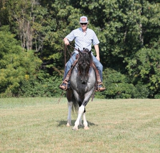 Poncho is as cool as he is different! This draftcross gelding stands around 15.3hh that will weigh around 1400lbs and he is a 5 years old. Poncho is a rare blue roan tobiano!!! Poncho is everyone’s best friend as he loves attention and is very calm natured. He is out of the same breeding program as several other top draftcross geldings that we have had over the last 5 years and every one of them has the right mind with the calm nature that makes them great family horses. Poncho has been ridden by every member of our family all the way down to our 7 year old daughter. He has been ridden down the highways and he is traffic safe as well. Poncho is great on trails and he will cross creeks, ditches, logs and navigate rough rocky areas. He has a smooth jog, a VERY VERY nice easy to set lope and a good stop! He neckreins around and backs with ease. He has been exposed to all kinds of wildlife such as deer or turkey or other animals like cows or dogs and will go anywhere that he is asked too. He has been ridden many miles in the mountains of Eastern Kentucky and encountered every obstacle possible on the trail. He will go up or down even the steepest slopes, across deep creeks, over downed trees, and over all types of rough terrain while still being sure footed. Poncho is not cinchy, cold backed, does not crib or weave. In addition to riding, Poncho has also been worked in farm machinery as well. He is the horse of a lifetime, don’t miss him!!! Feel free to contact me +13039908552