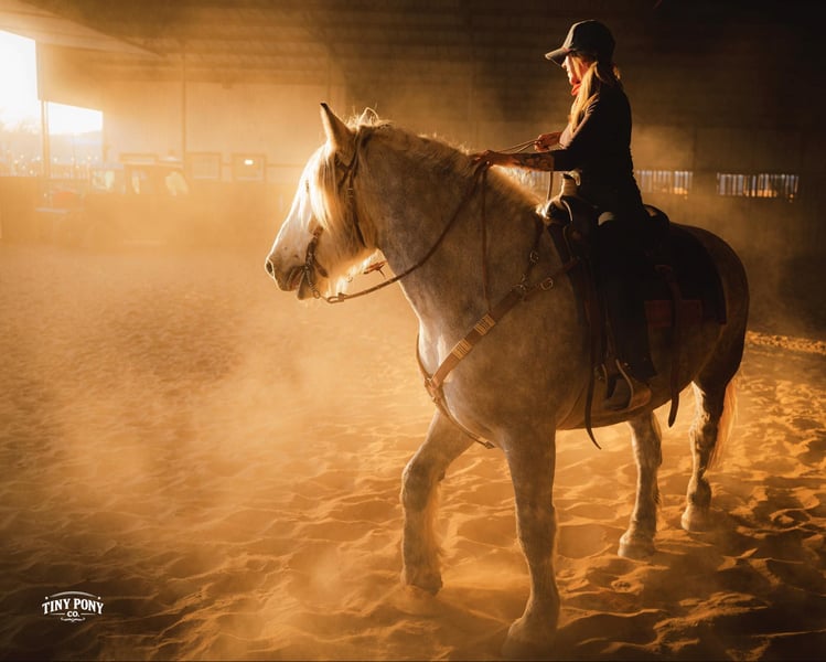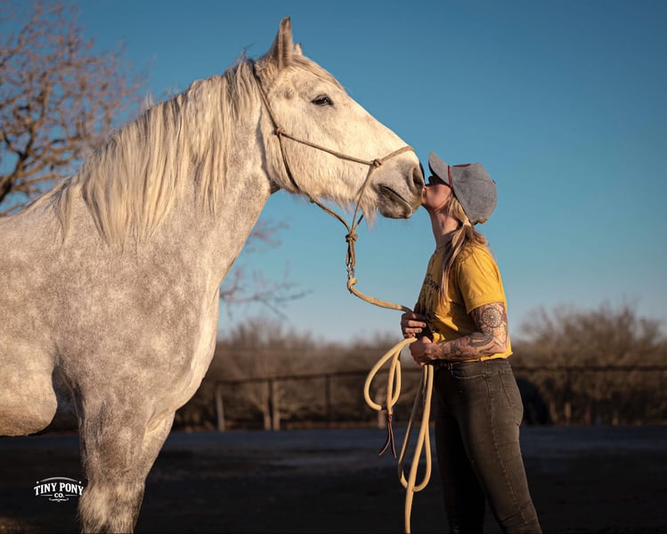 "AVAILABLE ON ONLINE HORSE AUCTION AT www DOT PlatinumEquineAuction DOT com BIDDING OPEN NOW thru SUNDAY | MARCH 1ST! *Final price will be determined on auction site* CONSIGNOR CONTACT INFO: Tiny Pony Co. 406-250-9530 LOCATION: Jacksboro, TX Tiny Pony Co. proudly offers Torgard. This gelding is a stunning and unique rose grey dapple, Old-World built Percheron. He is 6 years old and stands an impressive 16.2h. Torgard lives up to his name, which means “protected by thunder”. He has the presence of a war horse with the heart of a best friend. He has been a part of our program (and our family), since early last summer - we have grown to know him well and love him immensely. He has proven to be a calm, confident and kind horse. He thrives on deep connection, we calll him a “people horse” - he prefers to spend time in community with his humans. Torgard has more personality than a lot of folks we know. He is pure entertainment, very cheeky and playful - he will steal the gloves from your pocket, the hat off your head or the flag during training (see video!) His playfulness is nicely balanced with soft, snuggly moments - making him that much more lovable. On the ground, Torgard has learned to be respectful of his leaders personal space. He will stand tied (often napping) all day. He also ground ties nicely. He loves attention - lengthy grooming sessions and long chats take him right to his happy place. Torgard thoroughly enjoys working at liberty and is content to just hang out with his people - no lead rope required. In the saddle, Torgard feels gentle yet confident - as though he understands the importance of protecting his rider. He walks with purpose and pride. His gaits are very smooth for a gelding of his size and he is soft in the ribcage, moving around nicely for a horse of his stature. He is a comfortable ride, picks up the correct leads, side passes, half passes and stops nicely off the seat and “woah”. He isn’t heavy in the bridle and moves well off of leg pressure. He has the strength and stamina to easily carry any rider on an all day adventure. He is the same horse every day you pull him out to work - he puts his head right in the halter, ready to spend time with you - any way you’d like. Take this one anywhere and any which way you want - we believe he was born to hit the trails and that he would excel as a backcountry hunting mount, pack horse or even a mounted patrol horse. He is brave, sure footed, patiently stands rein on mane and loves being out in nature. He will also stand calmly to be mounted from the ground, a rock, a log and yes, even the scary mounting block! He is both willing and a quick study. Torgard can be kept out in a herd or in a stall with no trouble. He has proven to be middle to low end of the pecking order out on pasture. He loads and unloads from the trailer with ease. As much patience as this sweet horse has, when it comes to getting a trim from the farrier, he requires a little help and understanding. He is never rude, but struggles sometimes to find his balance - however, he has shown great progress in this area! This guy is an easy keeper that requires no maintenance and is currently on a forage only diet. He sells sound, UTD on vaccines and has freshly floated teeth. PPE welcome at buyer’s expense. Located in Jacksboro, TX. Text or call Courtney Maddux @ 406.250.9530 for more information or with questions! Tiny Pony Co. riders are 5’6 and 6’5 for reference.