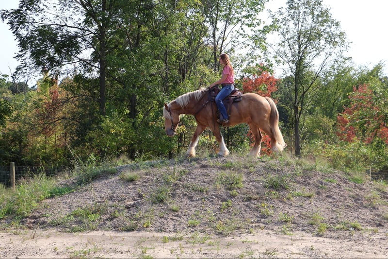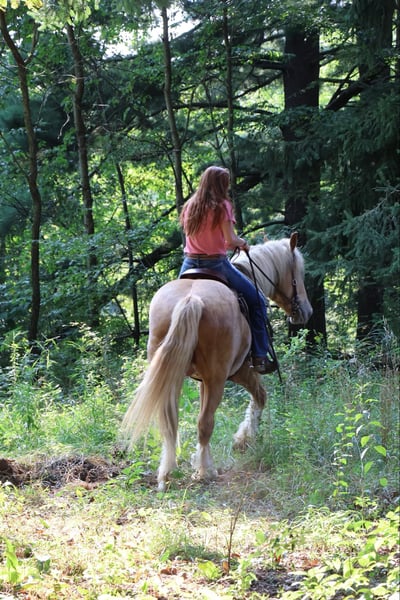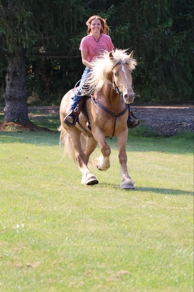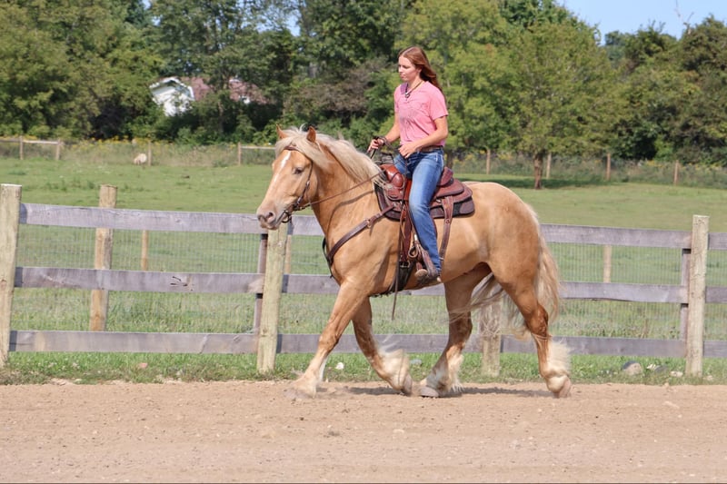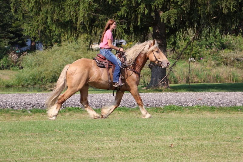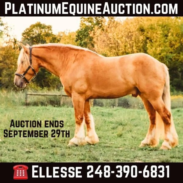 ONLINE AUCTION Place your bids at www.PlatinumEquineAuction.com Starting Bid $3500 Auction ends September 29th, 2024 Need a new saddle? Check out White Rock Saddles on our website or Facebook! Blackstones Golden Boy, or Sargent as we call him around the farm is the kind of horse that turns heads wherever he goes. This stunning 4-year-old, 16.2hh champagne colored American Cream Gypsy Vanner cross gelding is not just a remarkable sight. He shines like pure gold in the sun and has a gorgeous blonde mane and tail. he is a powerhouse of strength, versatility, and athleticism. For a horse of his size, Sargent moves with incredible grace and fluidity, making him not only a reliable mount but also an athlete in his own right. Whether you are riding Western, English, or bareback, Sargent delivers an exceptional experience, seamlessly transitioning between disciplines with ease. What truly makes Sargent stand out is his “been there, done that” attitude. He is the definition of a bombproof horse—absolutely safe in any environment. Sargent has been ridden on state roads, in the woods, open fields, and has even gone on a shopping trip to our local farm store! His beautiful golden color blonde mane and tail and flowing feathers capture everyone’s attention! One glance into his big hazel eyes will steal your heart. Out on the trails, Sargents calm, and steady nature shines. Water crossings, tarps, bridges and other common obstacles do not phase him in the slightest. His even temperament makes him an ideal horse for beginners who need a forgiving partner, while his experience and smooth gaits make him just as enjoyable for advanced riders. Sargent is the rare horse that adapts to his rider’s needs, making him a perfect fit for anyone from novice to seasoned equestrians. And speaking of smoothness, Sargents three gaits are simply unbeatable. His walk, trot, and canter are incredibly fluid and comfortable, making him perfect for all-day rides without leaving you sore. Whether you are working in the arena or exploring the trails, Sargents athleticism and stamina ensure he will keep going strong, mile after mile. In short, Sargent is the full package: strikingly beautiful, strong, athletic, and most importantly, safe. If you are looking for a versatile horse that excels in both riding and driving, Sargent is the perfect partner. He is ready to take on anything, whether you are a beginner looking for safety or an experienced rider seeking a smooth, dependable horse for long adventures. Sargent lives in Howell, MI 48855. Please call or text Ellesse Schwartz at 248-390-6831 for more information. ONLINE AUCTION Place your bids at www.PlatinumEquineAuction.com Starting Bid $3500 Auction ends September 29th, 2024 Need a new saddle? Check out White Rock Saddles on our website or Facebook!