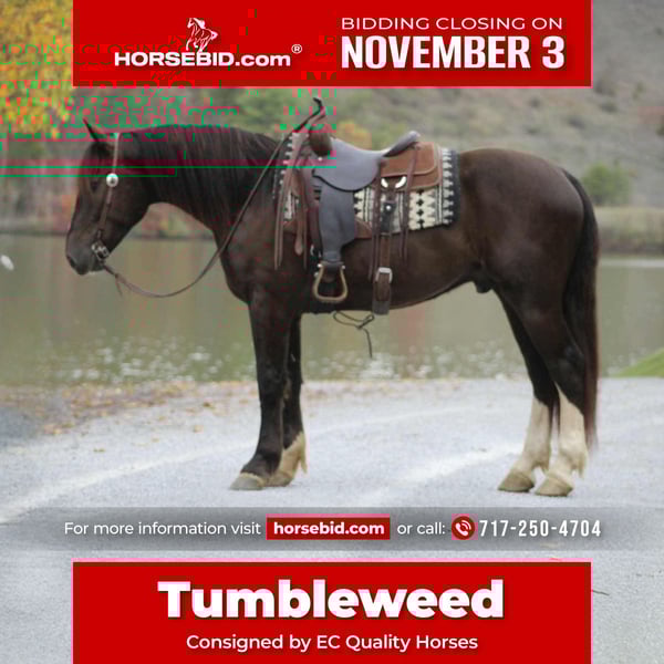 ⚜️𝐓𝐇𝐄 𝐅𝐀𝐋𝐋 𝐇𝐄𝐑𝐈𝐓𝐀𝐆𝐄 𝐂𝐋𝐀𝐒𝐒𝐈𝐂⚜️ Happening now thru MONDAY | NOVEMBER 3rd - Available EXCLUSIVELY on HorseBid's website! For more details and to register visit: www.Horsebid.com CONSIGNOR CONTACT: EC Quality Horses 717-250-4704 LOCATION: Beaver Springs, Pa BREED: Crossbred REGISTERED: No COLOR: Bay HEIGHT: 16 AGE: 5 GENDER: Gelding Check out this big stand up gelding! With his drool worthy looks and astonishing way of riding you won’t find another crossbred like Tumbleweed! Tumbleweed is a 5yr old Bay Crossbred Gelding. He stands approximately 16hh tall and made to perfection! Tumbleweed rides extremely well in or out of the arena. He will walk, trot, and canter. He picks up both of his leads. He has a big floating trot, and an easy slow canter. Tumbleweed is the kind that’s easy to ride. You can let him sit for days or weeks at a time and he will always ride off the same. He’s readable, gentle, and always willing! Tumbleweed is the type you can give any task to and he will give it his all. He’s the true definition of a big puppy dog. Tumbleweed would excel in lots of different disciplines such as English Equitation, ranch versatility, or just a trail horse. We have trail ridden Tumbleweed everywhere! He will go through water and cross over logs. He is easy going and always ride off with confidence. Tumbleweed stands to get saddled, unsaddled, mounted, and dismounted from. Wrangler also stands great for the farrier and vet. He has a good disposition and is always a gentleman to be around. He loads and unloads on and off the trailer. Tumbleweed is selling 100% sound and sane, with NO vices! Tumbleweed will come with a current coggins and health certificate after purchase! If you have any questions or would like more information regarding Tumbleweed please don’t hesitate to reach out to Carley @ 717-250-4704.