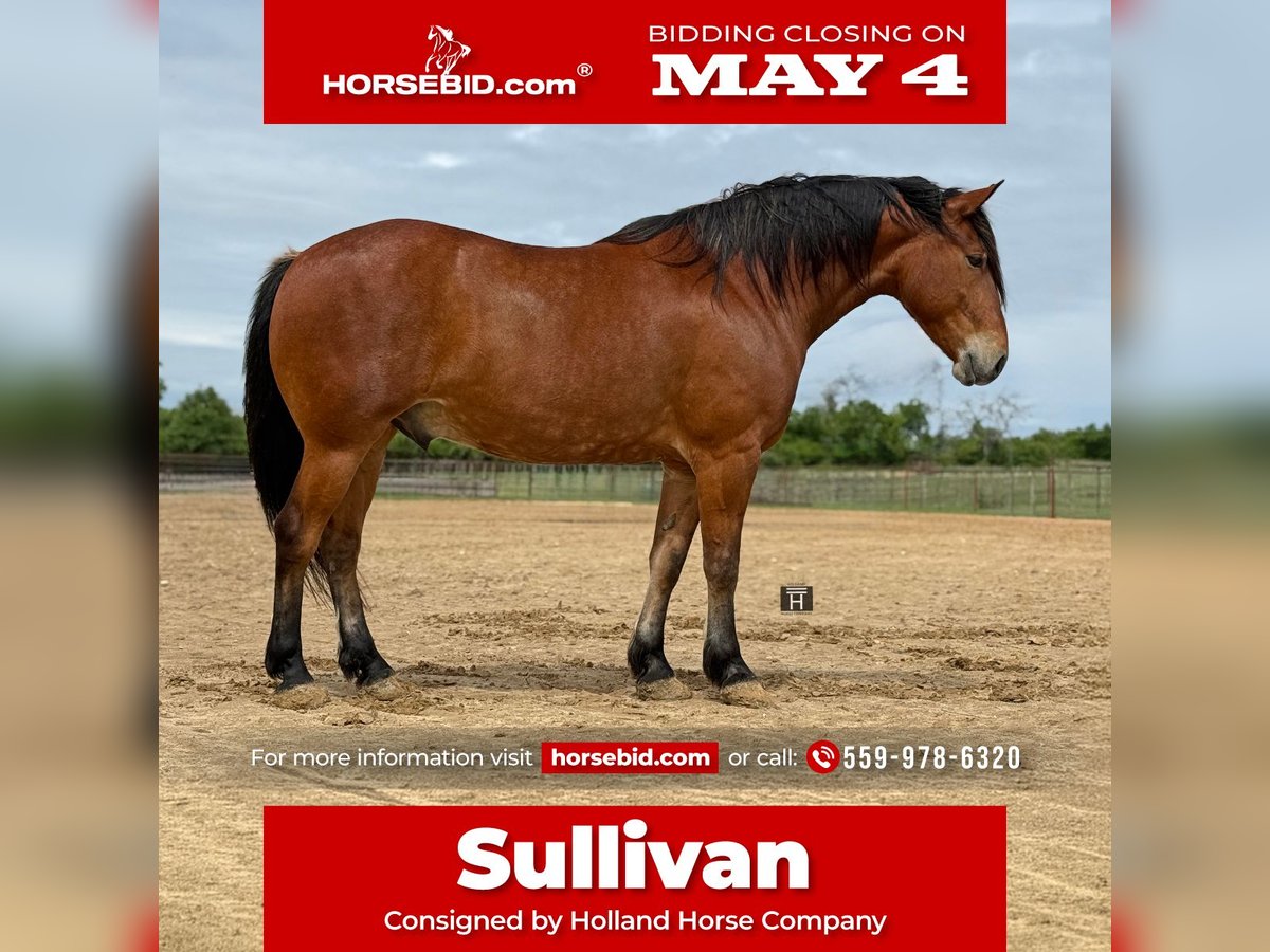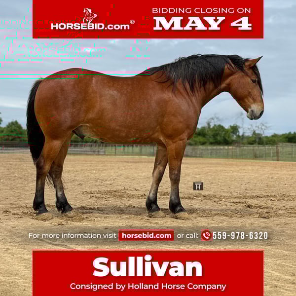 ▪️▫️◾️𝐭𝐡𝐞 𝑴𝒂𝒚 𝐒𝐞𝐥𝐞𝐜𝐭◾️▫️▪️ Happening now thru MONDAY | MAY 4th - Available EXCLUSIVELY on HorseBid's website! For more details and to register visit: www.Horsebid.com CONSIGNOR CONTACT: Holland Horse Company 559-978-6320 LOCATION: Weatherford, TX BREED: Draft Cross REGISTERED: No REGISTERED NAME: Sullivan COLOR: Bay HEIGHT: 16.1 AGE: 7 GENDER: Gelding Sullivan is a big hunk of a gelding at the prime age of 7 years old and standing the perfect 16.1 hands. He has life experience in just about every aspect - trail riding, ranch work, jumping, driving, arena, etc. He has been exposed to a lot of the world like kids, pets, livestock, automobiles, bicycles, farm equipment, etc and we have hauled him to many different locations to see the sights and try new things. Sullivan is a great trail mount and loves exploring the outdoors. He is always perky eared and seems to take everything in. He loves the water and will play in it if allowed. He is extremely sure footed and is always paying attention to where he is going. He will cross all the obstacles you point him at and has no problem going out alone or with others. Sullivan has been used on the ranch and at the sale barn and has some cow sense and knows a days work. He is rope broke and has no problem pulling just about anything, opening/shutting gates, sorting etc. Sullivan rides English and has been started over fences. He has definite potential to go on with and would make a great fox hunter. He stands for the mounting block or to be mounted from the ground. Along with all the formal riding and experiences Sullivan is used to our family life of chaos with kids, balls, bicycles, goats, dogs, etc. He is safe to be around and has great manners. He is easy to catch, good for the farrier, pastures well with others and can also stall alone. Sullivan is sound, straight and clean legged. He is gentle, kind and very willing. He has never offered any funny business. FMI call/text Chanel with Holland Horse Company 559-978-6320. We are happy to answer questions and help arrange shipping nationwide.