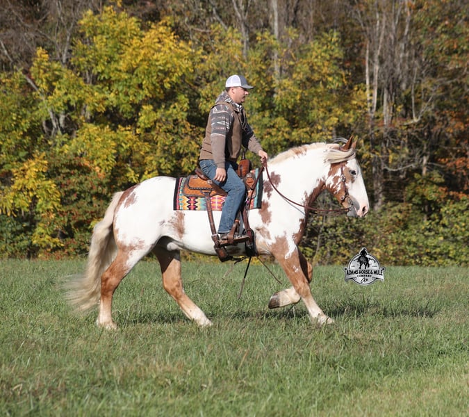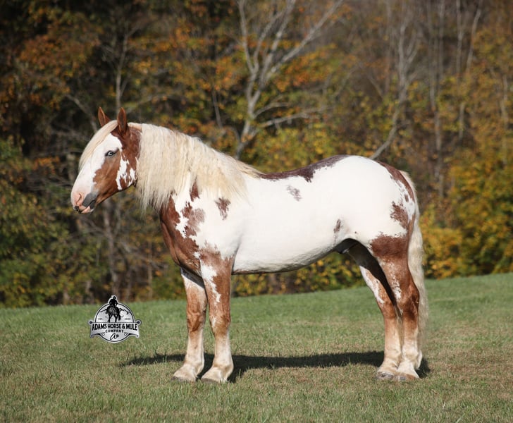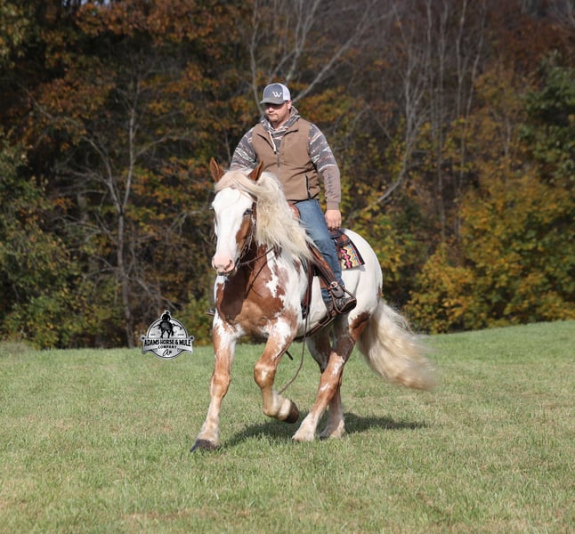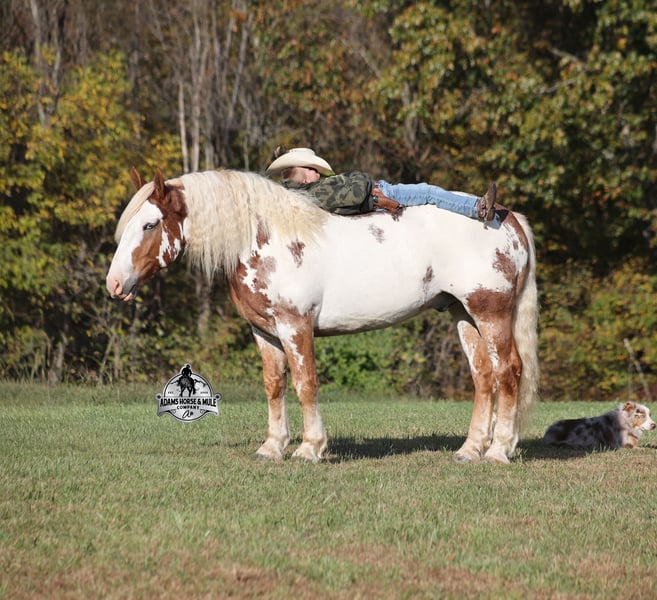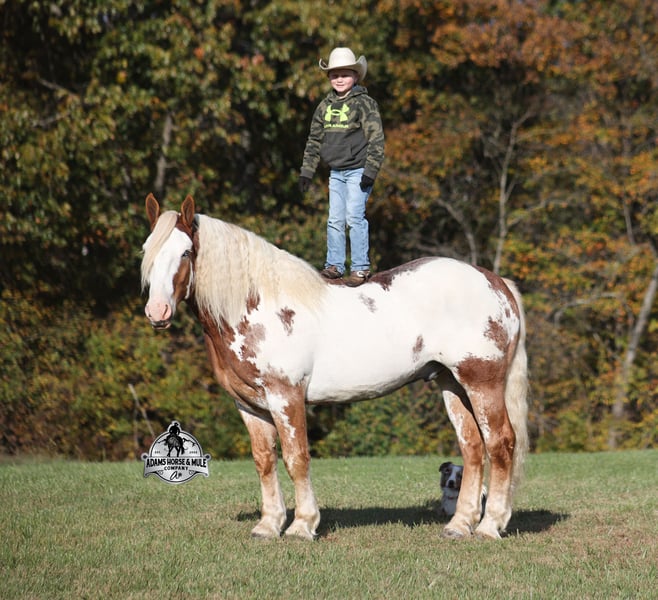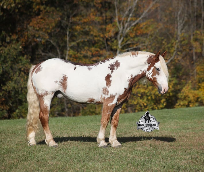 Go to visit our website for more pics and a video www.AdamsHorseAndMuleCo.com AHAMC has been in the horse business and sold horses over the internet since 2005. We have a long track record of success with hundreds of happy customers. We work hard to match riders with the correct horses and specialize in beginner safe, family friendly horses that have been used and checked out by our family! We can set up transportation anywhere in the US and look forward to working with you.Maximus is a magnificent looking 16.1h+, RARE Chestnut Overo, Draftcross gelding that is weighing in around 1400lbs! He is 6 years old and is a very stocky built horse. Maximus is one that does a little bit of everything! He is very well harness broke, pulls all farm implements and carriages as well. He’s been ridden around the ranch, checked cows and rode fences. Maximus is a slow and laid back type of horse that will just ease along down the trails with no hesitation. He is a horse that the whole family will love and one that will help build everyone’s confidence levels! He will suit the youngest to the oldest riders. He has been camping in several states and has been ridden by all ages of beginners. When out on the ranch or going down the trails he will cross creeks, ditches, logs and navigate rough rocky areas. He is safe in traffic safe whether that be trucks or cars. He has a nice jog, his lope is smooth as well and he lopes nice circles! He has been exposed to all kinds of wildlife such as deer or turkey. If you are a big ol feller, a lil bitty lady or a combination of each… Maximus will take care of you and you will love him for years to come! Feel free to call Eric 606-308-2461 with any questions!