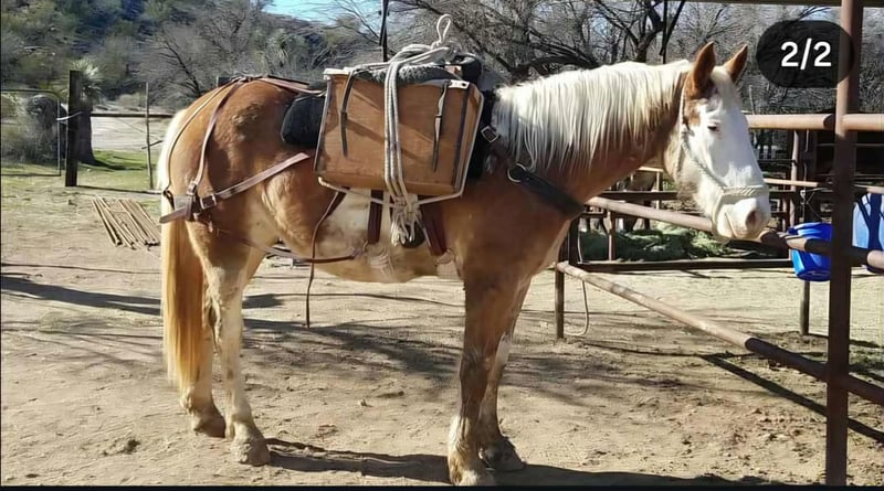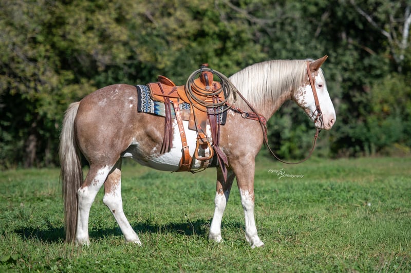 🎲𝓽𝓱𝓮 𝐑𝐈𝐃𝐄𝐑'𝐒 𝓒𝓱𝓸𝓲𝓬𝓮🎲 Happening now thru MONDAY | NOVEMBER 17th - Available EXCLUSIVELY on HorseBid's website! For more details and to register visit: www.Horsebid.com CONSIGNOR CONTACT: Rafter D Mules & Codie Brown 651-303-7056 and 719-691-8646 LOCATION: Hastings, MN BREED: Draft Cross REGISTERED: No COLOR: Red Roan Sabino HEIGHT: 16 AGE: 10 GENDER: Mare Uncommon in every way and outstanding in the very least; all while being as handy and safe as they come. Two Tone is a well-rounded mare that has a variety of jobs on her resume. She has been in our program for several years, as she was owned and trained by Codie. Many of the photos you will see were taken throughout the years of owning her. Two Tone was trained and used in the feed yards; she can rope and hold anything you are brave enough to catch. She has been used to pack in a pack string and has also led pack strings through the switchbacks in and out of camp. She is broke to hobble and has been on many overnight camps. Two Tone has been trail ridden through the wide-open country and the mountains. As if that is not an extensive enough resume... She has also been used as a pickup horse in rodeos where she picked up cowboys off of broncs and shagged bulls. She has had the privilege of carrying our nations flag at the rodeo during the national anthem in front of a packed audience. Two Tone has been ridden by cowboys and cowgirls, by riders who are young and old, from the least experienced to the most. This mare has been a true pleasure to own, and we are excited to see her give the same great experience to someone else. Her disposition is phenomenal, making it incredibly easy to say that she is as pretty on the inside as she is on the outside. One glance at her is all it takes to know that this mare is capable of turning every head! Two Tone hasn't just been trained; she has had years of experience where she has been ridden miles throughout the nation. Though she rides great inside, she has all the experience and confidence to ride outside doing any job or casually trail riding. You can leave her off for months and have no concern about cinching her up and riding off. She is going to give you the same great ride every time with complete consistency. No matter who you put in the saddle, Two Tone is going to take care of them, and go any direction she is pointed. She will side pass across an arena, correctly take her leads on cue while loping pretty circles, has an impressive extended trot, a big stop and a nice turn around for a mare of her size. She has athletic ability that is much more comparable to a quarter horse than a draft horse. She is an easy keeper, loads and hauls well, stands for the farrier, and is easy to catch. Two Tone gets along well whether she is stalled or turned out. She pastures well with other mares or geldings and is not marish whatsoever. She is easy going no matter what you ask of her. Whether she is getting a bath, or riding through the creek, she loves water! She has even raised a baby that was just as good looking as she is, with all of the jaw dropping color. There really isn't anything that this mare is not capable of. If you have questions about Two Tone or would like to meet her prior to the auction ending please contact Dillon at 651-303-7056 or Codie at 719-691-8646. We want to make sure that she gets the best home, so please do not hesitate to reach out! She is truly the mare of a lifetime, and whoever gets her, will love her just as much as we have.