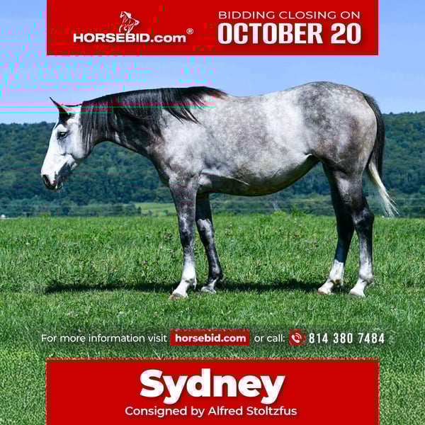 ♦️ 𝐭𝐡𝐞 𝐀𝐌𝐄𝐑𝐈𝐂𝐀𝐍 𝓕𝓪𝓵𝓵 𝓒𝓵𝓪𝓼𝓼𝓲𝓬 ♦️ Happening now thru MONDAY | OCTOBER 20th - Available EXCLUSIVELY on HorseBid's website! For more details and to register visit: www.Horsebid.com CONSIGNOR CONTACT: Alfred Stoltzfus 814 380 7484 LOCATION: Rebersburg, PA BREED: Draft cross REGISTERED: No COLOR: Grey HEIGHT: 15.3 AGE: 4 GENDER: Mare Sydney is a 15.3 hand 4 yr old beautiful Grey draft cross mare that is very quiet and safe for anybody to ride, she is my 5 yr old daughters go to horse and she has ridden her on trails, through water, in the arena and all over the farm. Sydney has a very sweet personality and loves attention and is always the first to the gate to meet you.. Sydney is puppy-dog gentle making her a great partner for almost anybody to ride. Sydney has been exposed to tarps, bouncy balls and carries the flag. She has been on a 3 day overnight trail rides and has taken it all in stride!! Sydney stands to be mounted, tacked up and to be bathed and shod. Sydney rides great in or outside the arena and picks up her leads nicely. She does well in the stall and gets along well pastured with other horses. She is up to date on farrier, dewormer and had her teeth done this summer. Sydney rides out alone or in a group and is very easy to ride. She is 100% sane and sound. For more information or to come meet her at our farm, contact Alfred 814 380 7484 We can help arrange shipping anywhere in the United States!!