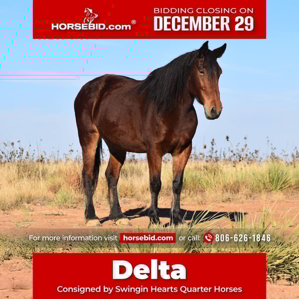 ⚜️𝐓𝐇𝐄 𝓗𝓮𝓻𝓲𝓽𝓪𝓰𝓮 𝐖𝐢𝐧𝐭𝐞𝐫 𝓒𝓵𝓪𝓼𝓼𝓲𝓬⚜️ Happening now thru MONDAY | DECEMBER 29th - Available EXCLUSIVELY on HorseBid's website! For more details and to register visit: www.Horsebid.com CONSIGNOR CONTACT: Swingin Hearts Quarter Horses 806-626-1846 LOCATION: Amarillo, TX BREED: Draft Cross REGISTERED: No REGISTERED NAME: DELTA COLOR: Bay HEIGHT: 15.2 AGE: 7 GENDER: Mare Delta is a 7-year-old draft cross mare, she is a proven, dependable ranch horse. She’s been used in cattle sales and in the feedyard, handling long days and tough conditions with ease. She’s also been trail rode along the Canadian River and is steady, confident, and sure-footed in rough country. She is excellent to rope on in ranch settings, stays calm and dependable, and has the size and strength you want for day-to-day work. This mare is easy to get along with, honest, and built to handle a full day’s riding. Whether you’re doctoring cattle, sorting, or riding outside, she’s a solid horse you can rely on. A good-minded, experienced ranch mare ready to go to work.