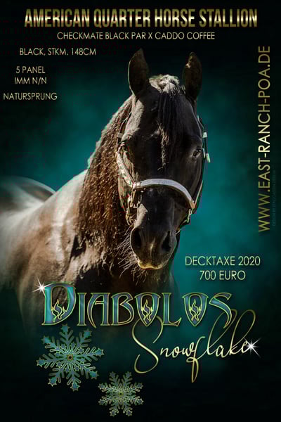 Diabolos Snowflake, Quarter Horse Stallion black, born 2003, stick size 148cm Dam: Caddo Coffee Sire: Checkmate Black Par HYPP / HERDA / PSSM / MH / GBED / IMM negatively tested Pedigree: https://www.allbreedpedigree.com/diabolos+snowflake " Divo " impresses with its enormous charisma and harmonious building. He is a very nice, thoughtful and cool stallion who can also be easily handled by children... a real Gentelman. He's a super lovely and decent guy who's biting, beating and rising strangers. Divo was under the saddle for many years! With " Diabolos Snowflake " we have the opportunity to bring fresh blood to the POA breeding and to pair old foundation lines. His pedigree is focused on cutting / reining and so we are very curious how his 1st offspring will develop with us. His mother " Caddo Coffee " was the most successful Reining / Cutting mare in Europe! His father was the last son of the AQHA Leading Sires Par Three and half-brother to the multiple world champion Zan Parr Bar, an all-rounder who was one of the most successful reining horse-breeders and also highly successful in the keeper horse breeding. We are happy to call " Divo " our own and are all more than enthusiastic about this gentle stallion. If you are interested please message or call 0171 64 10 578 www.east-ranch-poa.de