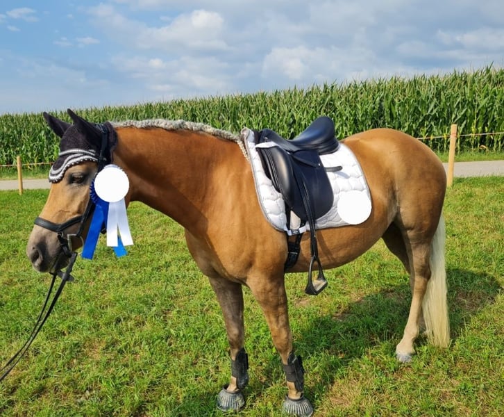 Schweren Herzens suche ich ein neues Zuhause für meine liebe, im Reitponytyp stehende Haflingerstute mit wunderschöner langer Mähne (1,47m). Die Stute ist sehr fein zu reiten und geht leicht durchs Genick. In der Dressur ist sie bis L platziert. Im Training wurde schon mit M-Lektionen begonnen. Sie springt auch gerne und mit schönem Sprungablauf bis A-Höhe. Ausreiten gehen kann man mit ihr sowohl alleine als auch in der Gruppe. Außerdem ist sie sehr gut in Boden-/Freiarbeit und im Gelassenheitstraining bzw. Working Equitation ausgebildet. Sie kann auch von Kindern geritten werden und zeigt sich hierbei sehr vorsichtig. Somit wäre sie auch als Lehrpferd für eine Familie geeignet. Das Zubehör (Dressursattel, Springsattel, Trense, Decken usw.) können gegen einen Aufpreis gerne mitgekauft werden. Bei Interesse gerne melden, ich kann auch gerne weitere Fotos/Videos schicken. Zur Vorbeugung von Reittourismus fällt für Probereiten eine Gebühr von 30 Euro an.