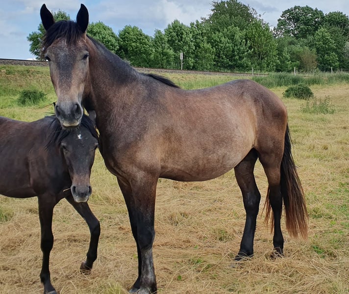 Sie sind auf der Suche nach einen widerstandsfähigen, kräftigen und robusten Vierbeiner mit gutem Sozialverhalten? Als mittelständischer landwirtschaftlicher Betrieb züchten wir seit über 15 Jahren ein robustes sportliches Warmblut. Wir belegen unsere Stuten ausschließlich im Natursprung, meist ab Ende Mai und verzichten auf Interventionen wie Hormonbehandlung und Ultraschalluntersuchungen. Unsere Hengste decken die Stuten an der Hand die komplette Rosse über. Die Fohlen werden somit in der grünen Saison geboren und leben in den ersten 4 Wochen mit Ihren Müttern allein auf einer Weide um die Bindung zu festigen. Nachts stehen sie im Offenstall mit Paddock. Erst wenn die Fohlen etwas stabiler sind, dürfen sie mit in die große altersgemischte Stutenherde zu Oma und Tanten. Im Alter von 7 bis 8 Monate beginnen wir mit dem schonenden Absetzen der Fohlen, je nachdem wie es die Psyche zulässt. Die Fohlen werden zu Beginn erst nur für wenige Stunden von den Müttern getrennt, dann über Nacht separiert und gehen tagsüber wieder in die Herde. Diese Prozedur ist sowohl für das Fohlen als auch für die Mutterstute angenehmer und kann bis zu drei Wochen in Anspruch nehmen. Die männlichen Absetzer kommen dann auf eine separate Weide zu Ihren älteren Geschwistern um diese erst einmal durch den Zaun kennenzulernen. Erst wenn dort alles entspannt ist und die älteren Hengste keinerlei negative Signale aussenden, werden die Jüngsten integriert. Für die nächsten drei bis vier Jahre wachsen die Junghengste nun in der Herde auf und werden mit Heu, Stroh, Mineralien und Kraftfutter versorgt. Sie wechseln zweimal jährlich den Standort und haben 24/7 Weide mit Zugang zu einem Stallzelt. Desweiteren kennen die Hengste Zugverkehr sowie Schafe und Ziegen. Unsere Pferde haben ein starkes Immunsystem und konnten durch verschiedene Bodenverhältnisse starke Sehnen und Bänder entwickeln. Sie haben gelernt sich auch bei ungünstigen Bodenverhältnissen dementsprechend fortzubewegen. Natürlich können wir nicht dafür garantieren das unsere Pferde nie krank werden, jedoch haben wir durch diese Art der Aufzucht ein widerstandsfähiges Lebewesen gezüchtet welches weiß, wie es sich bei starker Sonneneinstrahlung, Niederschlag in allen Aggregatzuständen und Wind verhalten muss. Wir freuen uns über jeden freundlichen Kontakt und können über alles reden. Wenn alles passt ist der Preis verhandelbar und auch als Ratenzahlung möglich... Wir verkaufen hier einen 3jährigen Hengst. Er hat ein derzeitiges Stockmaß von 1,58m. Der Vater ist ein PRE und kann auf der Anlage besichtigt werden. Die Mutter ist ein Mix aus Tinker und Friese. Harry P. steht im Herdenverband 24/7 auf der Weide. Er lebte die ersten 8 Lebensmonate mit seiner Mama im Offenstall und wurde dann in die Aufzuchtherde schonend integriert. Nun ist er groß und alt genug um geritten zu werden. Er ist roh und kann von seinen neuen Besitzern nach Ihren Wünschen geformt werden... Er kennt Zugverkehr, Bahnübergang, Traktoren und Hunde... Fragen werden natürlich gern beantwortet. Er ist ehr ruhig, zu Beginn erstmal vorsichtig bei Menschen die er nicht kennt. Auf Grund seines Alters ist er natürlich noch roh. Robust aufgewachsen im Herdenverband ist er sozialisiert und benimmt sich. Ein Pferd sehr robustes Pferd welches in seinem Leben noch keine gesundheitlichen Schwierigkeiten hatte.