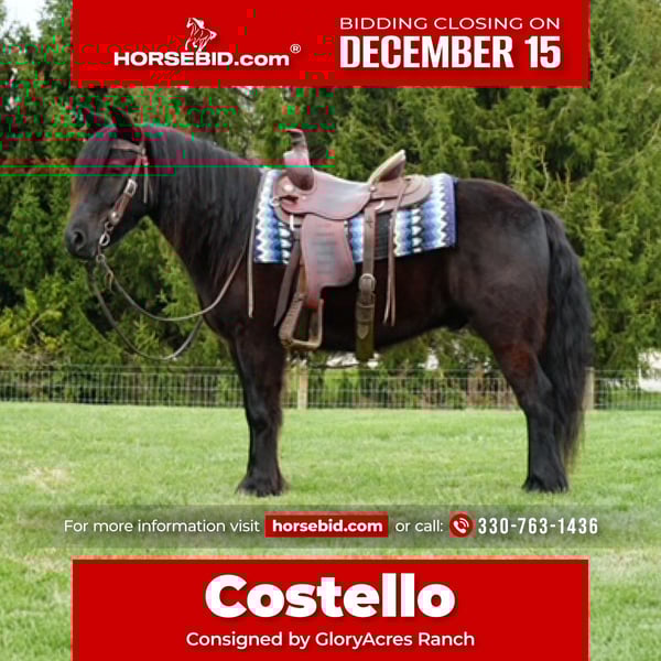🎄𝐓𝐇𝐄 𝑯𝒐𝒍𝒊𝒅𝒂𝒚 𝐂𝐋𝐀𝐒𝐒𝐈𝐂🎄 Happening now thru MONDAY | DECEMBER 15th - Available EXCLUSIVELY on HorseBid's website! For more details and to register visit: www.Horsebid.com CONSIGNOR CONTACT: GloryAcres Ranch 330-763-1436 LOCATION: Wooster Ohio BREED: Fell Pony REGISTERED: Yes REGISTERED NAME: Felllegend Costello COLOR: Black HEIGHT: 13.3 AGE: 4 GENDER: Gelding Costello is a 4 year old black fell pony gelding that is good broke to ride very calm and gentle and very teachable with great temperament. Loves attention and loves to please yet is athletic and very safe and sound .has been on trail rides with couple hundred horses rides good in arena and around the farm he is ready to go to whatever level you want to take him .has good barn manners and is great in pasture with other horses has been line driven, stands good for farrier. If you’re looking for a horse to have around for a long time that is fun and great to have around bee sure to check him out .for more info on to come meet him call Norman 330-763-1436