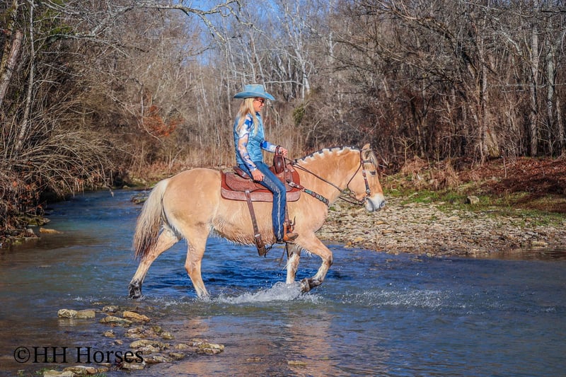 ONLINE AUCTION Place your bids at www.PlatinumEquineAuction.com Starting Bid $3500 Auction ends February 23rd, 2025 Need a new saddle? Check out White Rock Saddles on our website or Facebook! This is “COUCH POTATO”, a family friendly, quiet, safe, and gentle PUREBRED NORWEGIAN FJORD MARE that has all the great characteristics of the wonderful breed. She is 14.2 hands tall and 12 years old. The Fjords are one of the oldest and purest breeds in the world. This mare has great agility, a strong neck, sturdy legs, and excellent feet. She is broke to ride and drive. This mare has been ridden by beginners and youth riders. She will not take advantage of her rider. She will only go as fast as she is asked to and she is patient. She stands to harness, tack, mount, hitch, and groom. She loads, bathes, stands tied, and hauls with no fuss. She will trail ride anywhere you want to go quietly under saddle or harness. She will cross any depth of water and she is extra sure footed. She is cautious, kind, confident, and fun. She is safe for beginner teamsters and is uber user friendly to harness and drive. She is traffic safe and has been in holiday parades, wagons trains, and weekend camping trips. She has pulled a cart, sleigh, wagon, and farm machinery. She is broke nice and any level equestrian can appreciate how nice she is trained and how well she carries herself. She is a big comfy couch to ride, being extra smooth and keeping herself well balanced when maneuvering through rough, rocky, and steep terrain. She is a great horse for anyone to enjoy. Located in Flemingsburg, KY. For more info or to make a BUY IT NOW offer contact HH Horses Erin 304-238-4155. ONLINE AUCTION Place your bids at www.PlatinumEquineAuction.com Starting Bid $3500 Auction ends February 23rd, 2025 Need a new saddle? Check out White Rock Saddles on our website or Facebook!