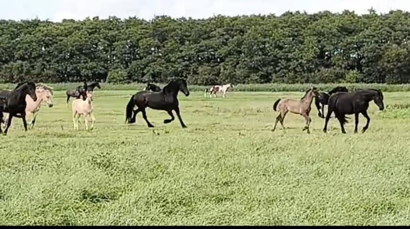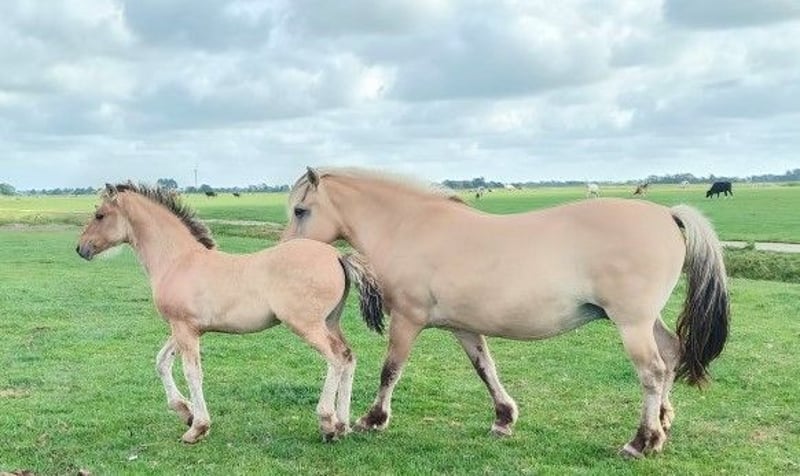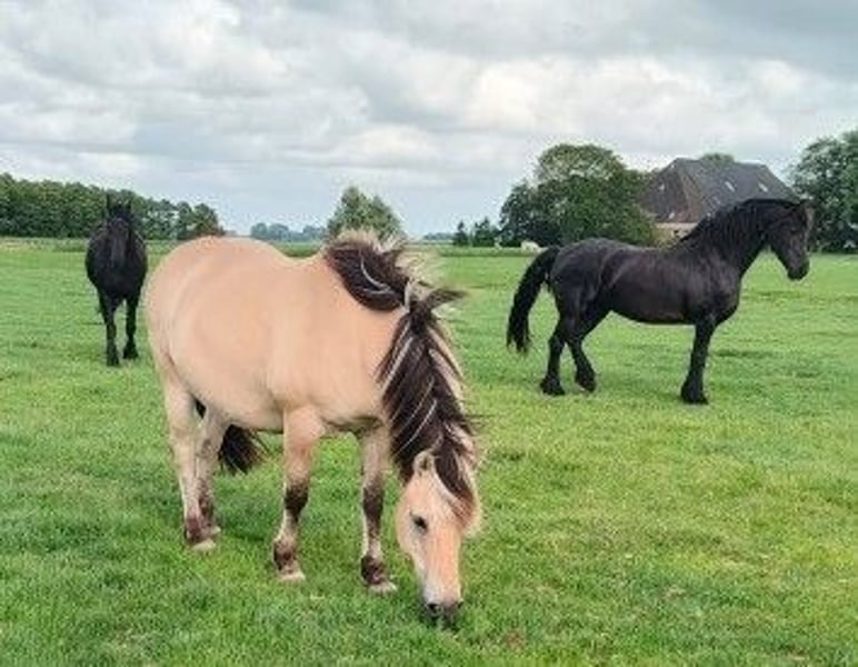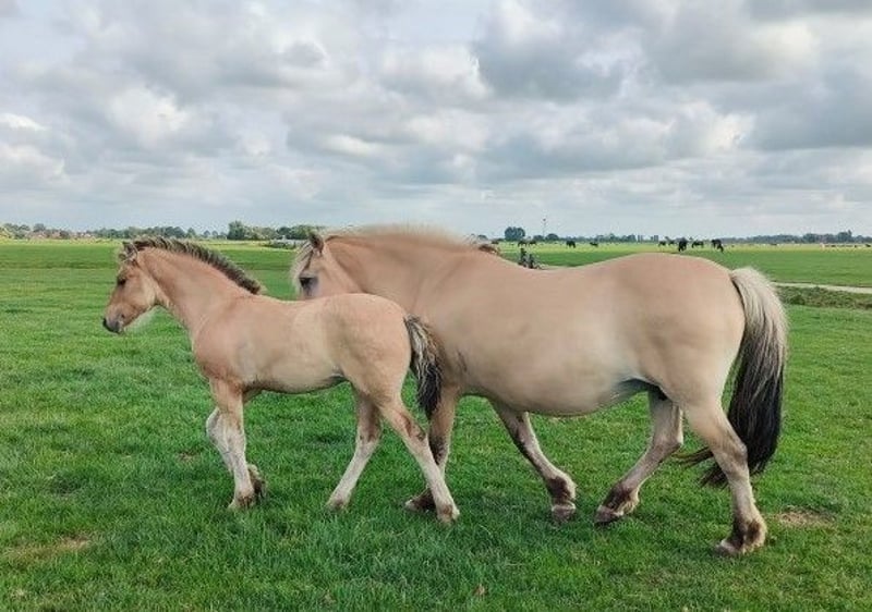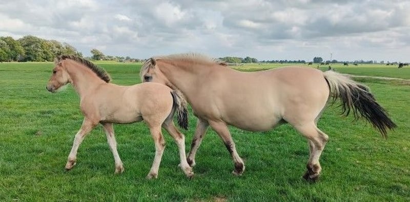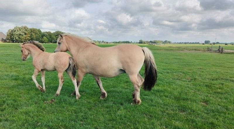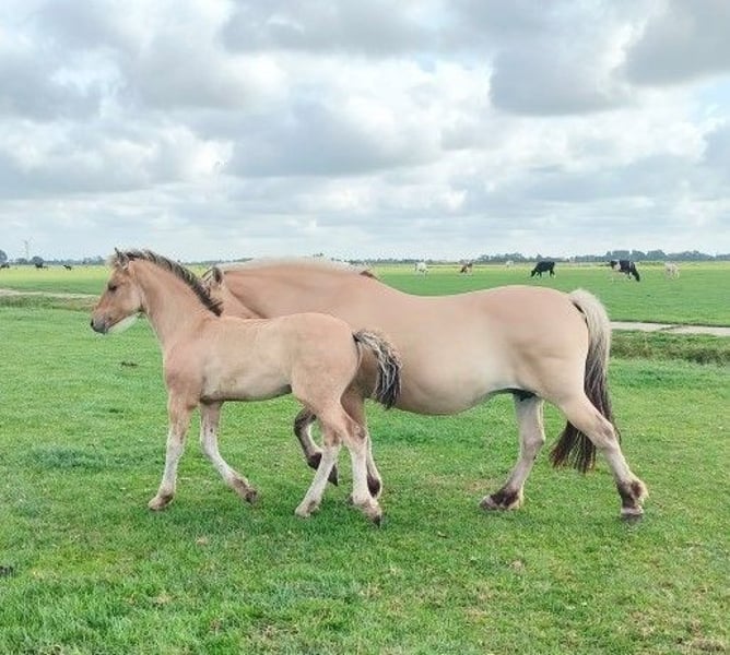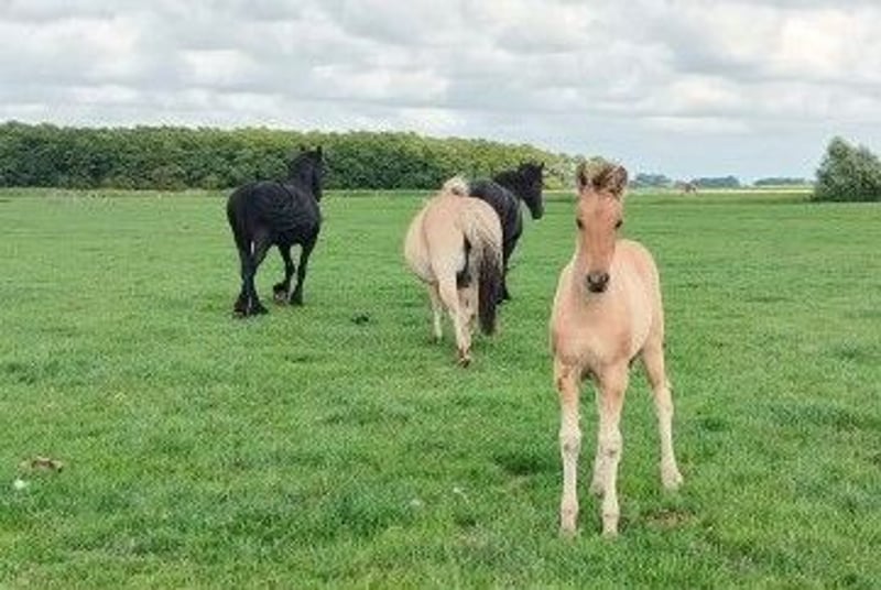 Heel mooi bijzonder bay dun kleurig Fries x Fjord merrieveulen geboren eind april 2025 uit ouders met heel goede bloedlijnen (o.a. Norbert 444, Beart 411 en Jasper 366). Van de meeste bijzondere stoeterij ‘Vrije Paarden’ in Friesland! Bij ons groeien de paarden nog puur natuur op in kuddeverband op grote uitgestrekte weides. Onze denkhengst loopt het hele jaar rond in zijn kudde mee. Dus worden de veulens grootgebracht door moeder, tantes en hun vader en altijd met veel andere veulens. Dat betekent dat je bij ons altijd een super sociaal en stabiel in de kudde opgegroeid paard vindt. Dit lieve merrieveulen zoekt een fijn nieuw thuis. Ze heeft een mooie parmantige oprichting en mooie gangen. Moeder is een lieve Fjord van 1.51m groot, vader een prachtige Friese hengst van 1.67m. Verwachte eindstokmaat van het veulen is 1.56-1.60m. Ze kan eind oktober gespeend worden en kent het allerbelangrijkste: het kudde ABC. Wij zijn elke dag bij onze paarden maar trainen de paarden niet, dus al onze paarden zijn nog volledig groen. Het grote voordeel is dat de paarden wel mensen kennen, goed gesocialiseerd zijn in de kudde, geen slechte ervaringen hebben gehad en je ze alles kunt leren zoals jij wilt! Jaarlijks hebben wij vanuit onze mooie familiestoeterij in Tzummarum (Nederland) keuze uit circa 40 geweldig mooie • Friese veulens • barock pinto veulens • fries gekruiste veulens • quarter veulens met AQHA papier • Friese paarden, barock pinto paarden en AQHA quarters (1-13 jaar) Let op: Onze paarden zijn altijd gechipt met paspoort. Onze dekhengsten hebben een stamboekpapier maar we fokken omwille van betaalbare prijzen meestal zonder stamboekpapier. Onze quarters zijn veelal wel met AQHA papier. Alle paarden zijn nog groen en onbeleerd. Groot voordeel: je hebt bij ons altijd veel keus en bezichtigt meerdere merries en hengsten (kunnen hier worden gecastreerd). Bij ons vind je zeker je droompaard! Onze paarden kenmerken zich door een goed karakter, relaxed, koel, sterk, gezond opgegroeid en lief. Je bent van harte welkom op onze familiestoeterij in Tzummarum (Friesland, Nederland). Mail lezen we niet altijd, daarom graag bellen of via Whatsapp!