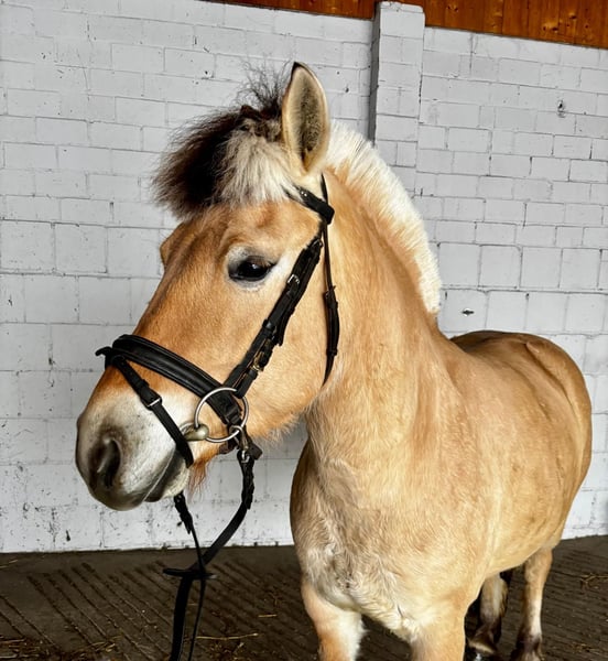 Astra is a very gentle and well-behaved Fjord mare. She is easy for beginners and children to handle. She is familiar with various terrains, arenas, and indoor riding halls. She has been driven single and double, including in traffic. She is farrier- and loading-safe.