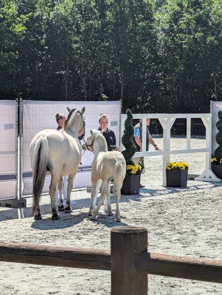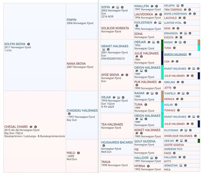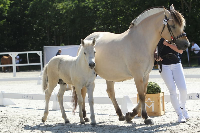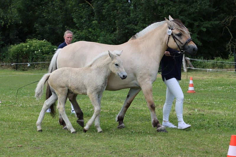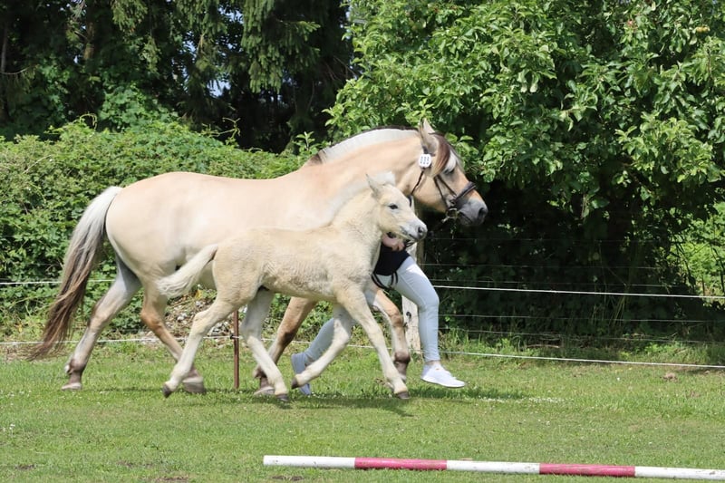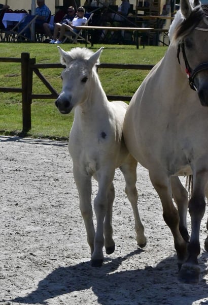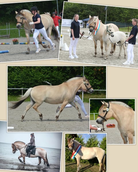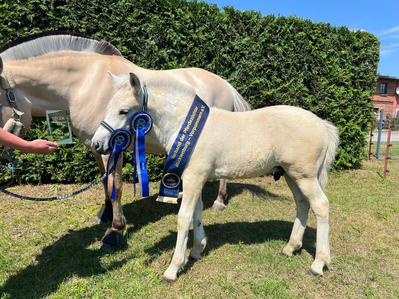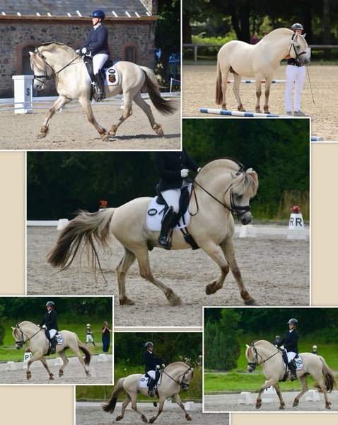 For sale is our Fjord horse colt born on May 25, 2025. "Janikos Sammy" is not only a visual stunner in terms of color but is also very people-oriented and loves to be petted. Sammy is a white dun (brown isabelle dun) and could potentially be a red carrier; this will be confirmed through a genetic test. He would be ideal as a riding horse, as he is likely to reach a final height of around 153 cm, but we would also love to see him in breeding due to his excellent lineage. Upon sale, he will receive full papers from the MV Horse Breeding Association, is microchipped, is accustomed to trailer loading, has regular farrier visits every 6-8 weeks, and is well-handled in many other aspects. Our ponies are familiar with stalls but primarily grow up in pasture or open stable conditions with other horses and ponies. His full brother impressed at the Elite Foal Championship MV in 2022, receiving a dream score of 9.1 and the winner's ribbon among Fjord horses. He has been living in Switzerland since weaning and is set to become a competition riding horse. (Picture 9) Now, about his parents: his father is none other than the multiple federal premium, elite, and performance stallion Solfin Skovå, who competes at the L* level. He completed his stallion performance test with a result of 83.20, was the federal champion in Berlin in 2017, and the federal reserve champion in Bad Segeberg and Berlin in 2022 and 2025... these are just a few of his successes. His mother is the federal premium, state premium, and performance mare Chegal Charei, who was named the champion mare of Fjord horses at MeLa in 2018 and received the silver animal breeding award; in 2024, she received the 1b federal premium in Alsfeld. If this young man has piqued your interest, a personal meeting can easily be arranged. Janikos Sammy *May 25, 2025 White dun Estimated final height: 153 cm Sire: B.Pr/EH/LH Solfin Skovå (Picture 7) White dun 153 cm Grandsire: FinFin Maternal Grandsire: Granit Halsnaes Dam: B.Pr/St.Pr/LS Chegal Charei (Picture 8) Light brown dun 152 cm Sire: Cadeau Halsnaes Maternal Grandsire: Højgaards Bacardi