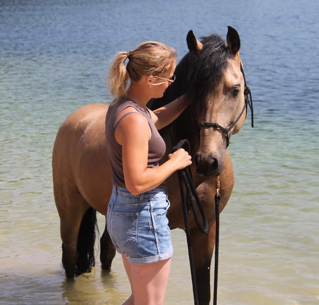 Georgia – Young Mare with Charisma Seeks Her Person Georgia is a 3-year-old mare born and raised on our farm. Her dam is a Black Overo Paint Horse, and her sire is a Palomino Azteca, giving her a unique and striking appearance. In daily handling, she proves to be confident and uncomplicated. She is familiar with tying and hoof handling and remains relaxed and easy to manage during these routines. Georgia is not yet backed. However, she is regularly taken out on rides as a ground partner and is accustomed to being out and about in the company of others. In liberty work, she demonstrates a lot of joy and a special talent. She also shows herself to be very people-oriented, affectionate, and cuddly. She appears to be an ideal horse for someone who wishes to train a young horse themselves or with guidance, and to grow together through the process. For Georgia, we are looking for a home with people who enjoy nurturing and gently guiding her on her further path. If you are searching for a young horse that impresses with character, talent, and heart – Georgia might be the perfect partner for you. You can find us in 49779 Oberlangen. I am happy to share the exact address after a personal conversation. You can reach me at the mobile number 0162 4348386.