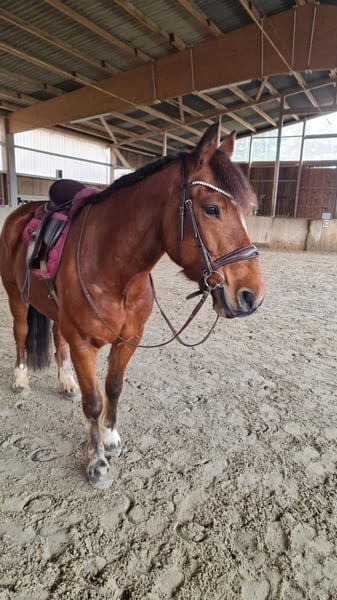 Eddie Enzo Freiberger Gelding Born in 2015 Barefoot Currently kept in a herd stall Height: 152 cm In mid-2023, we purchased a second Freiberger from a riding school for my partner (a beginner rider). However, he is not suitable for beginners, as he tends to buck. We had him thoroughly examined (blood tests, X-rays, gastroscopy, PSSM type 1 and 2 including muscle biopsy), but no findings were made (a single mild ringbone without clinical relevance, supported by a veterinary report). Since his arrival, he has been professionally driven in 2023 (single and pair harness). I only drive him in a two-wheel cart on the left rein, where he performs very well—happy and engaged. However, I do not ride him often enough to give him sufficient exercise (which is why he is currently quite overweight). He is driven almost daily in the lunging arena and, despite his figure, has excellent stamina. Additionally, I have re-established lunging training with him, as well as load training, etc. He is familiar with ground work and enjoys it. Initially, I also rode him outside, but I felt like I was on a ticking bomb. Since the beginning of 2024, he has not been ridden. Before coming to us, he had different riders, was regularly exercised outside, and also jumped. He also participated in pony club activities with very young children. Character-wise, he is a cuddler, gentle with children, affectionate, but sometimes a nervous bundle of energy for no apparent reason. I am selling him as a carriage horse. He can certainly be ridden (he has excellent basic gaits), but his strength and preference lie in driving. As a riding horse, I find him too "unpredictable." I wish for him to be kept in a herd stall or at least outside with the herd during the day (he is not very familiar with stabling) and to have more movement and interaction than I can currently provide. He is regularly vaccinated, dewormed, and his teeth are checked annually (most recently two weeks ago). Please feel free to contact me with any questions.