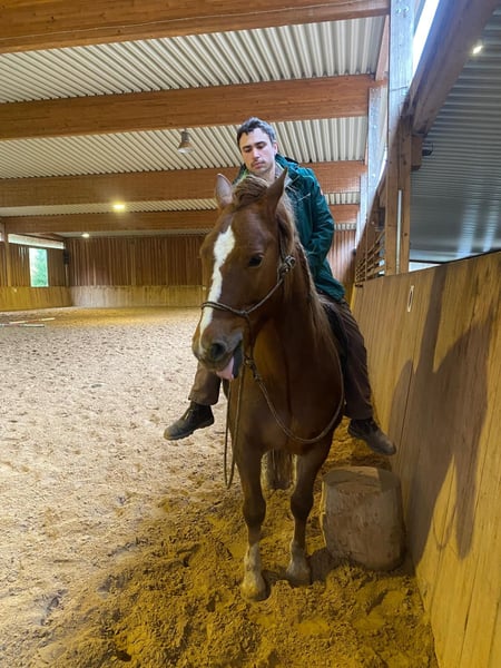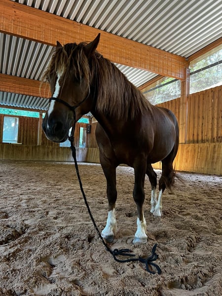 **Sales Advertisement: Franches-Montagnes Gelding** For sale is a beautiful Franches-Montagnes gelding, born in 2021. With a height of 155 cm, he is the ideal partner for leisure activities. This charming gelding impresses with his friendly, attentive nature. He comes from the Thüringeti auction 2023. He has been in training to learn the basics but is being sold as untrained, as he is very sensitive and needs a lot of reassurance. He is well-mannered and has already taken his first steps in the round pen under saddle; otherwise, he is familiar with groundwork and going for walks as preparation for a leisure horse. He is good with the farrier, and we regularly practice loading him onto a trailer, which has never been a problem. I am letting him go because the combination with me as a nervous rider is simply not the right fit. He is very sensitive and attentive to everything but needs experienced people. He is currently kept in an open stable and on pasture, which works great in the herd. He is not dominant but will not let others push him around. This is absolutely not an urgent sale; he should simply find his right person. If you have any questions or are interested, please feel free to reach out. We look forward to your message!