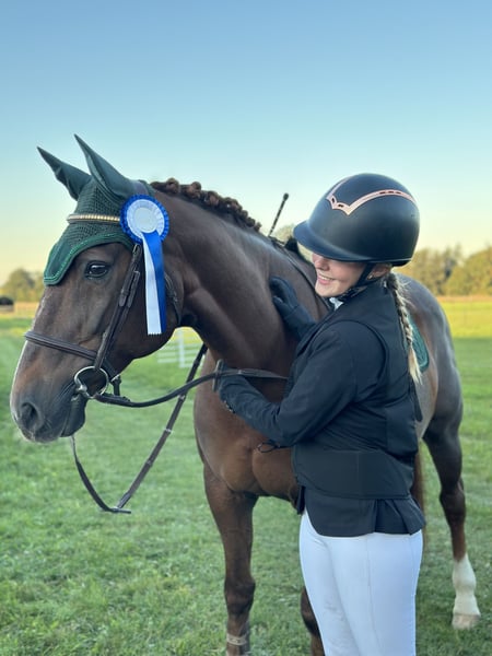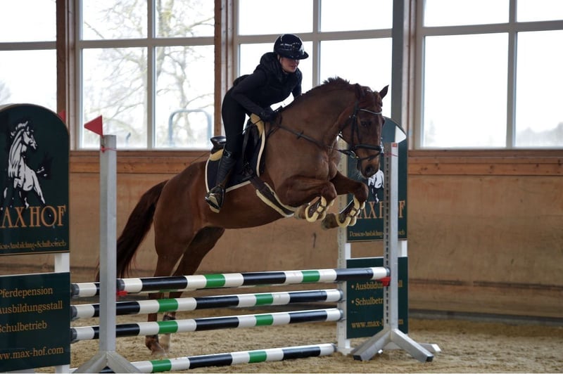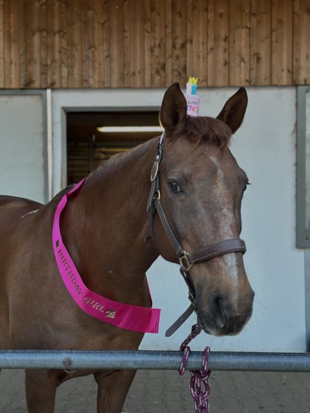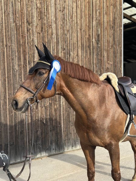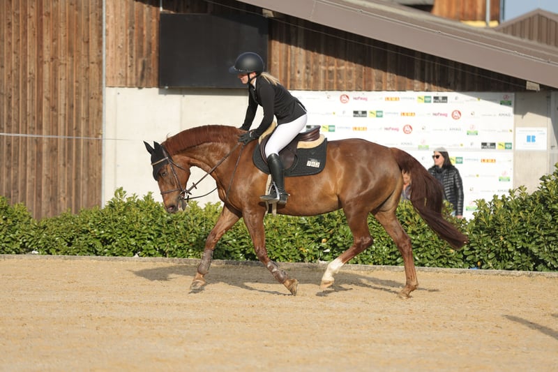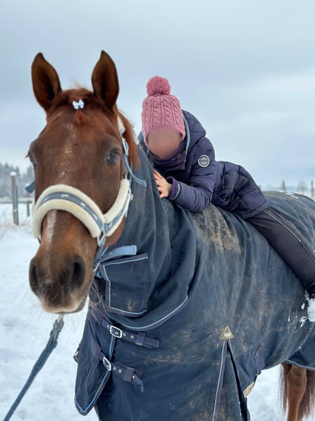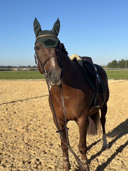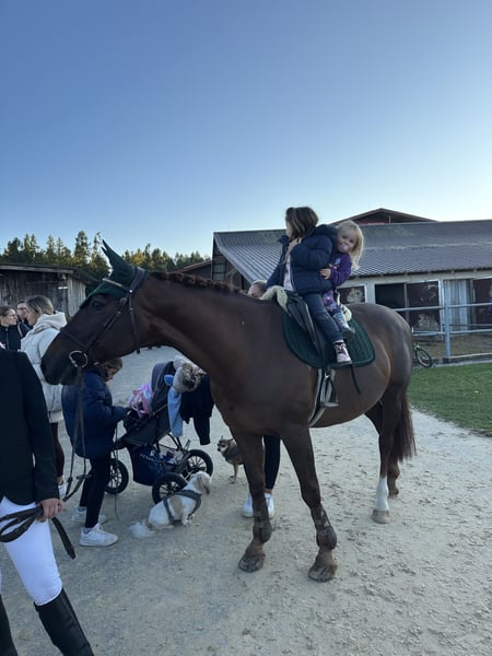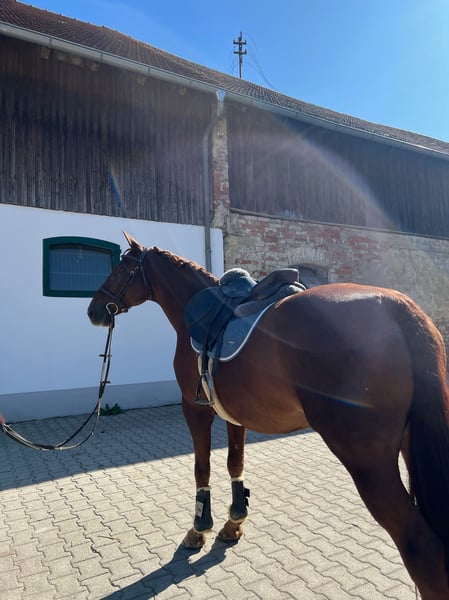 Una is truly a treasure! She is comfortable going alone or as a lead horse in the countryside (also with children and inexperienced riders). She is farrier- and loading-trustworthy, knows dogs and children (including those who whiz past her on ride-on cars or bicycles, or prefer to use the tying post for playing). Last year, she was first introduced at a competition in Austria and immediately earned a ribbon. This year, at an overnight event, she was placed in all three of her three starts with her 16-year-old rider. She also moves beautifully in dressage. She is familiar with ground work and calmness training, as well as riding with a halter, and handles all her supposedly spooky situations without flinching. She walks over mattresses, tarps, knows flags, ball pits, and patiently tolerates all kinds of mischief. Una is a horse that appreciates the variety of tasks she is given. I wouldn’t wish for her to only do dressage in the arena or jump four times a week. She really comes alive in the countryside. Jumping also brings her great joy. She knows the creek and has proven to be a little water rat. Currently, she is grazing on a large pasture with two other mares. She is front-shod and handles it very well. During the summer, she wears a fly sheet and hood because she is somewhat sensitive to bites and tends to rub herself vigorously. She has never reared or bucked! In nearly five years with us, she had only one small hoof abscess. Otherwise, she has always been healthy. Her teeth have been checked, and she last had physiotherapy in October. She is being sold with all her equipment, which is included in the price: an Ikonic jumping saddle, bridle, girth, under-blanket, rain sheet with neck cover. Gaiters and a saddle pad can also be included if desired. If you are looking for a horse that can make the whole family happy and wants to, then you’ve come to the right place. Una will only be sold if everything is right and to the best hands. Location: 85445 Please contact us if interested: 0176-24989677 Videos will follow shortly.