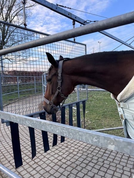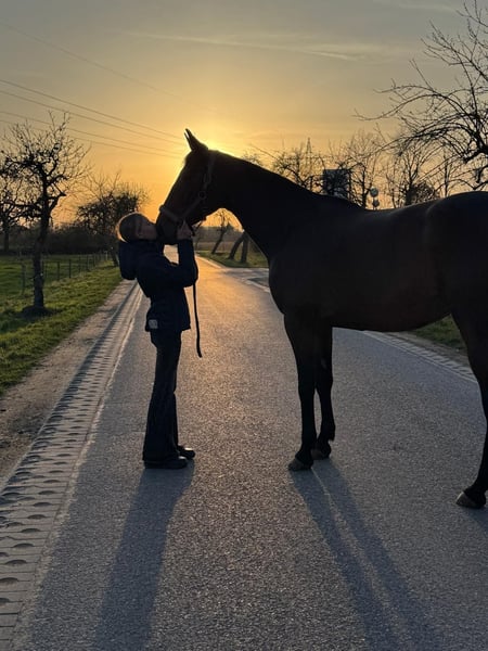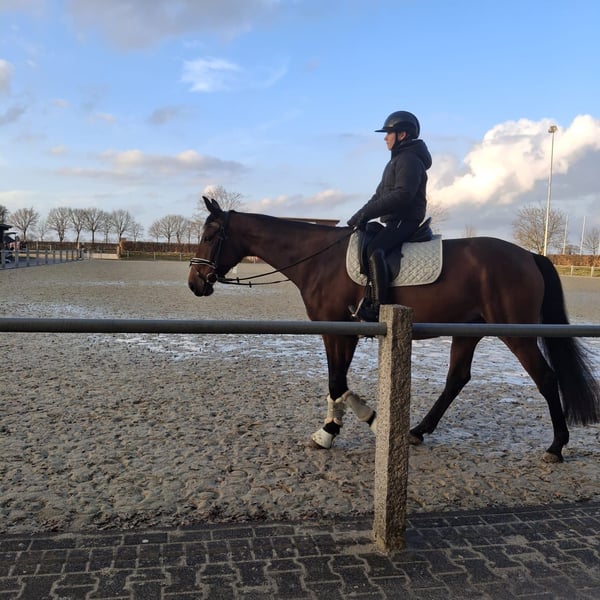 Zum Verkauf steht die 5-jährige Traberstute Louane Memory TF (geb. 2021) mit einem aktuellen Stockmaß von ca. 1,65 m (noch im Wachstum). Louane befindet sich aktuell im Beritt und zeigt sich als sensible, aber ehrliche Stute mit Entwicklungspotenzial. Sie verfügt über gute Grundgangarten, hat jedoch aktuell noch Schwierigkeiten beim sicheren Angaloppieren und benötigt hierbei eine klare, führende Hand. Im Gelände ist sie absolut zuverlässig und unerschrocken – auch größere Fahrzeuge wie LKW oder Traktoren sowie andere Tiere sind für sie kein Problem. Unter dem Sattel zeigt Sie ihre sensible Art, weshalb sie von einem erfahrenen Reiter gut gefördert und weiterentwickelt werden kann. Hier bedarf es einen klaren Rahmen,Erfahrung und Ruhe. Ausbildung & Eigenschaften: • im Beritt • geländesicher • vom Boden aus gearbeitet • nicht schreckhaft • kennt Umweltreize (LKW, Traktoren, Tiere) • verträglich mit anderen Pferden • schmiedefromm Weitere Angaben: • gute Abstammung, daher auch interessant für die Zucht • gesund • mit Papieren • Zubehör inklusive (z.B Kentaur Dressur Sattel) Standort: 59269 Beckum Das probereiten kostet 30€, die beim Kauf selbstverständlich angerechnet werden. Louane wird nur in erfahrene und fördernde Hände abgegeben. Platz vor Preis.
