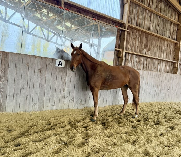 À vendre – Jument de 6 ans Jument alezane de 6 ans, 1m66 au garrot, pieds nus. Très agréable sous la selle, elle débute idéalement une reconversion orientée loisirs. Jument appliquée, avec une excellente capacité d’apprentissage, elle a déjà sauté une barre montée. Très douce au quotidien, elle conviendra à un cavalier confirmé ou à un bon cavalier encadré souhaitant poursuivre son évolution dans le calme et la bienveillance.