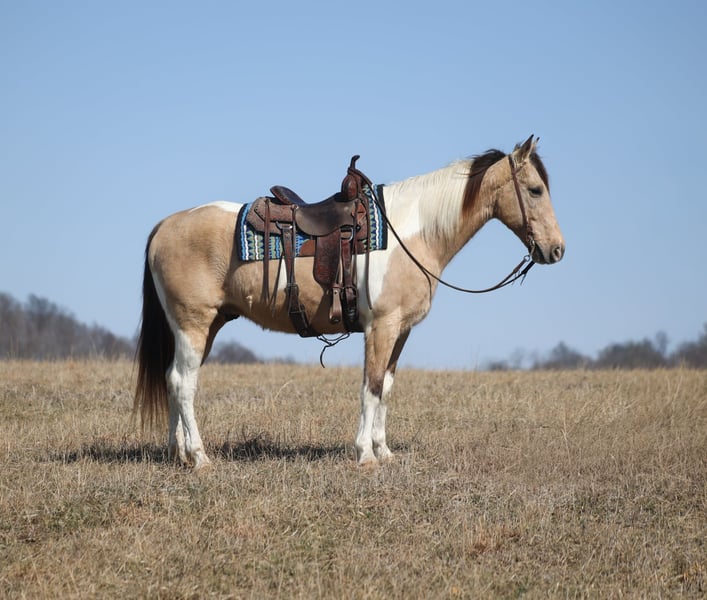 "AVAILABLE ON ONLINE HORSE AUCTION AT www DOT PlatinumEquineAuction DOT com BIDDING OPEN NOW thru SUNDAY | MARCH 15TH! *Final price will be determined on auction site* CONSIGNOR CONTACT INFO: Korey Patrick 606-310-2428 LOCATION: Brodhead, KY If you want color, class, experience and a nice ride... James is your guy! James is a super cool, buckskin tobiano, Friesian Cross gelding that is standing around 15.3hh and he is very well built. He is 10 years old and he has all the good looks, and with miles of experience to go along with it! James has been trail ridden throughout Kentucky, Tennessee and Virginia and he knows all about traveling and trails. He will cross creeks, ditches, logs and navigate rough rocky areas. He moves around real nice and is content to plod along down the trails as well! He has been exposed to all kinds of wildlife such as deer or turkey and will go anywhere that he is asked too. He will go up or down even the steepest slopes, across deep creeks, over downed trees, and over all types of rough terrain while still being sure footed. James has been ridden down the highways and is traffic safe. He is not cinchy, cold backed, does not crib or weave. If you want flashy, substance and safe... James is a great choice! Feel free to call Korey Patrick 606-310-2428 with any questions. Located in Brodhead, KY