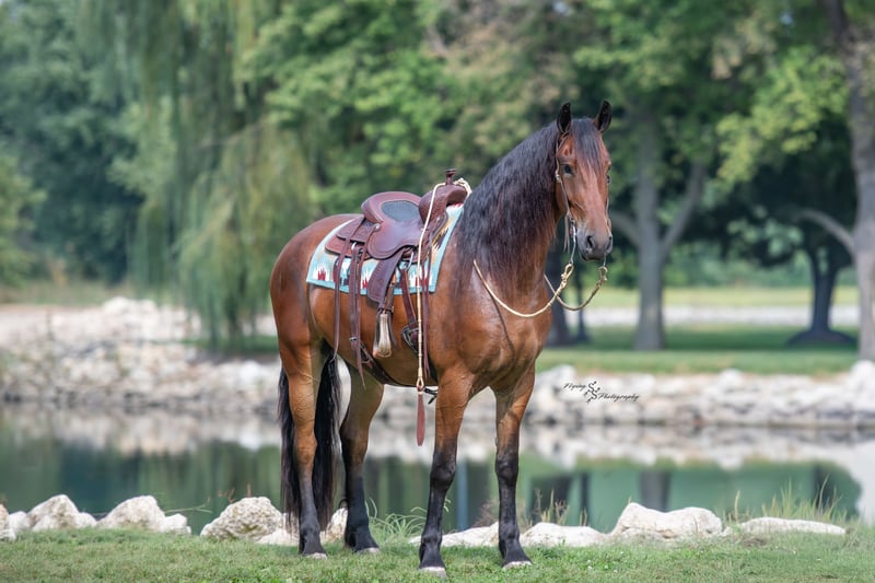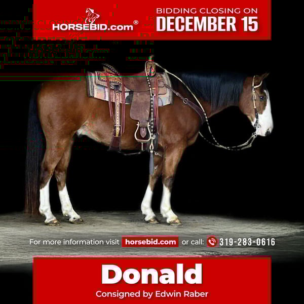 🎄𝐓𝐇𝐄 𝑯𝒐𝒍𝒊𝒅𝒂𝒚 𝐂𝐋𝐀𝐒𝐒𝐈𝐂🎄 Happening now thru MONDAY | DECEMBER 15th - Available EXCLUSIVELY on HorseBid's website! For more details and to register visit: www.Horsebid.com CONSIGNOR CONTACT: Edwin Raber 319-283-0616 LOCATION: Fairbank, IA BREED: FBHR Friesian Sporthorse REGISTERED: Yes REGISTERED NAME: Dutch Creek Donald COLOR: Bay HEIGHT: 16.2 AGE: 4 GENDER: Gelding One look at Donald is all it takes to confirm every reason why Friesians have been known as royal horses. He is the definition of elegance with the power to perform. Donald is a 4-year-old FBHR registered Friesian cross gelding who stands 16.2h, wears a size 3 shoe, and weighs in at approximately 1,400 lbs. He is an outstanding show prospect who has all of the potential in the world to excel in English events. Donald has been exposed to the sights on trails, obstacles in the arena, and even the hustle and bustle of small-town life. He is thoroughly desensitized and is ready to go on in his training. Donald has been started in dressage and already shows so much natural talent. He is such a beautiful mover that even people, who are inexperienced with horses, can see the raw ability that he has. Donald has been ridden extensively in both English and Western tack and has an excellent foundation in his training in both disciplines. We believe that this makes him so much more well-rounded and versatile for his next riding partner. Donald is a very forward mover, with an impressive extended trot. We feel that he would be best suited for someone who is intermediate to advanced in their showing and riding ability, or someone who is paired with a trainer. Donald could easily be paired with a beginner adult rider, with the aid of a trainer. Donald is sired by Zebb M a purebred Friesian Stallion and is out of a sporthorse mare who was 50% Friesian, thus making this stunning gelding 75% Friesian. Whether you have a preference for English or Western discipline, we believe that Donald will excel in Dressage or Western Dressage. If kept in training, he could also be very competitive in jumping, eventing, or equitation. Donald handles traffic well and is not bothered in the least by all of the distractions you typically see when driving through a small town. He crosses water without hesitation, gracefully walks over logs in a trail pattern or over downed timber out on the trail. He has been ridden around large and small livestock as well as poultry and has also been exposed to wildlife in fields and on trails. When doing arena work, Donald has been ridden in indoor and outdoor arenas, handling both with confidence. He has very impressive agility and is capable of adapting to different types of footing with ease. You can expect the same ride every time you mount up, as Donald is consistent in his performance even with extended time off. He is honest, you will have no need to worry about hump or buck, even when he is fresh. Donald is well mannered and does wonderful whether he is turned out in the paddock or kept stalled. When turned out, he gets along well with pasture mates and is easy to catch. Donald stands tied, cross ties, is a gentleman for the farrier and veterinarian, clips easily, and stands perfectly to be braided. He stands quietly to be tacked up, for polo wraps, and also stands for the mounting block. I am happy to speak with you or your trainer to ensure that Donald is the perfect fit for you. He will come with a current negative coggins and a Pre-purchase exam from my veterinarian. If you are interested in meeting Donald or have any questions prior to the auction ending, please call Edwin at 319-283-0616.